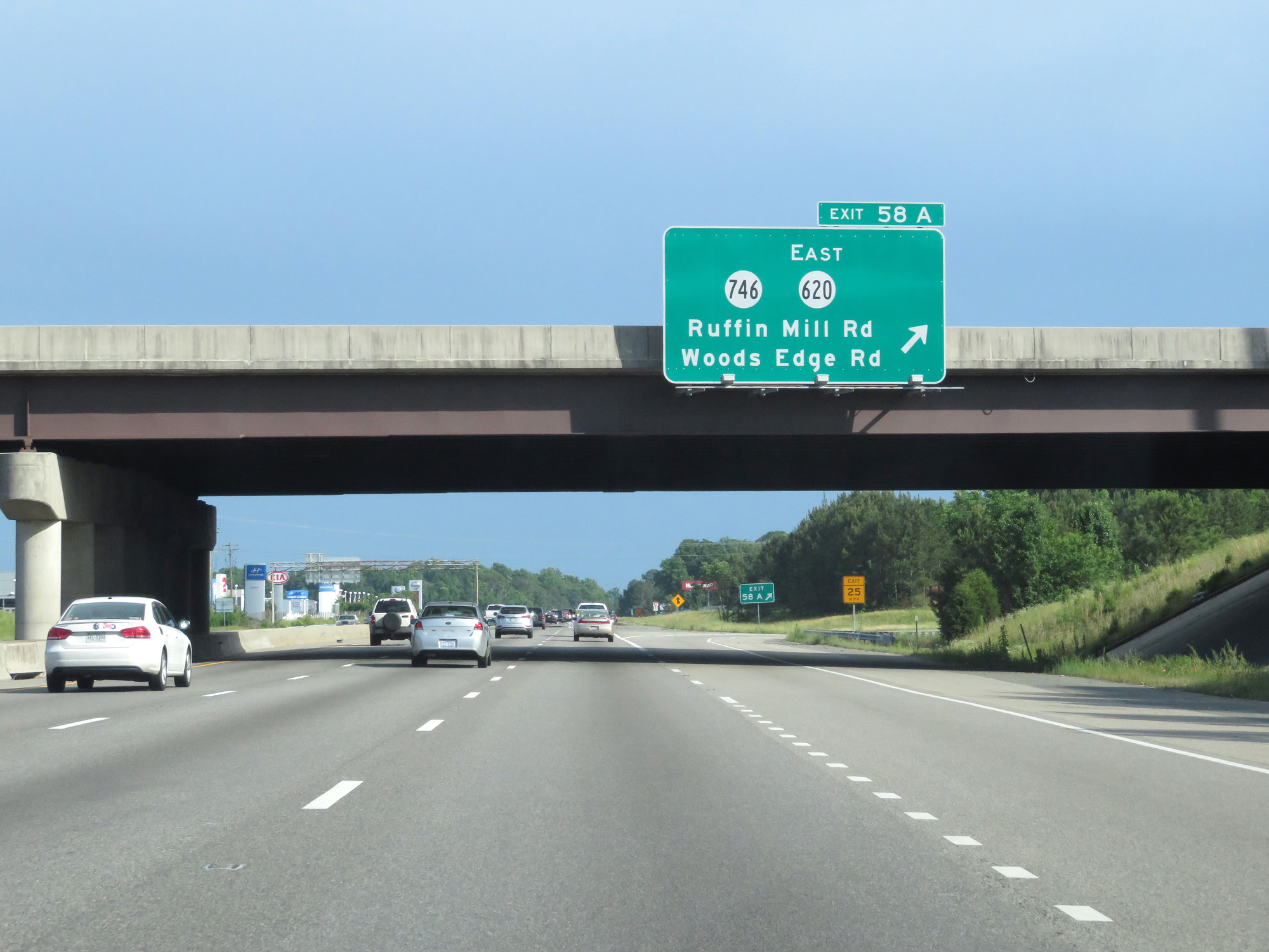 Interstate 95 South at Exit 58A: SR 746 / SR 620 East - Ruffin Mill Rd / Woods Edge Rd (Photo taken 5/19/17). |