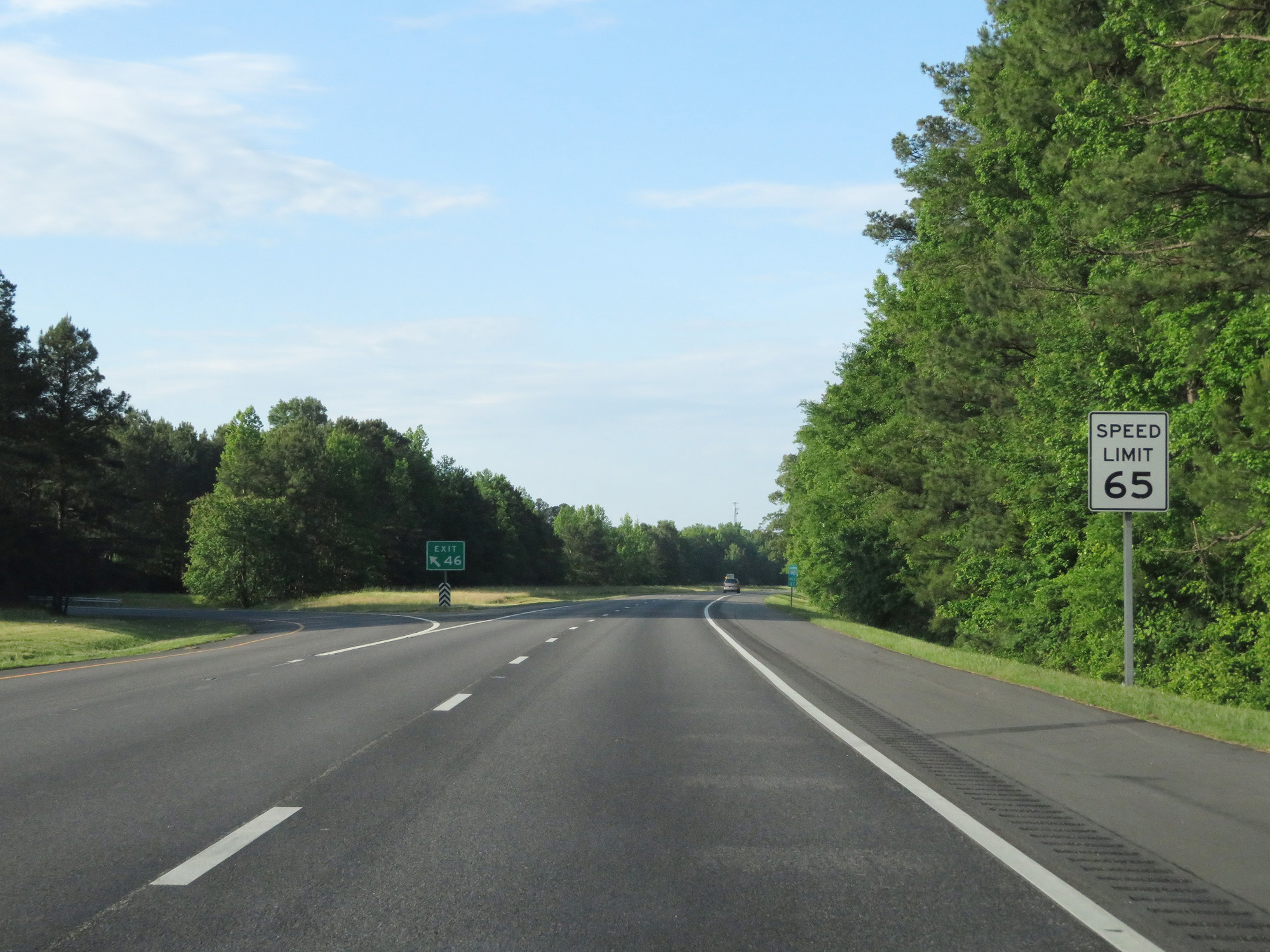 Gore point signage for Exit 46 on the left. The speed limit remains 65 mph for a bit longer. (Photo taken 5/20/17). |