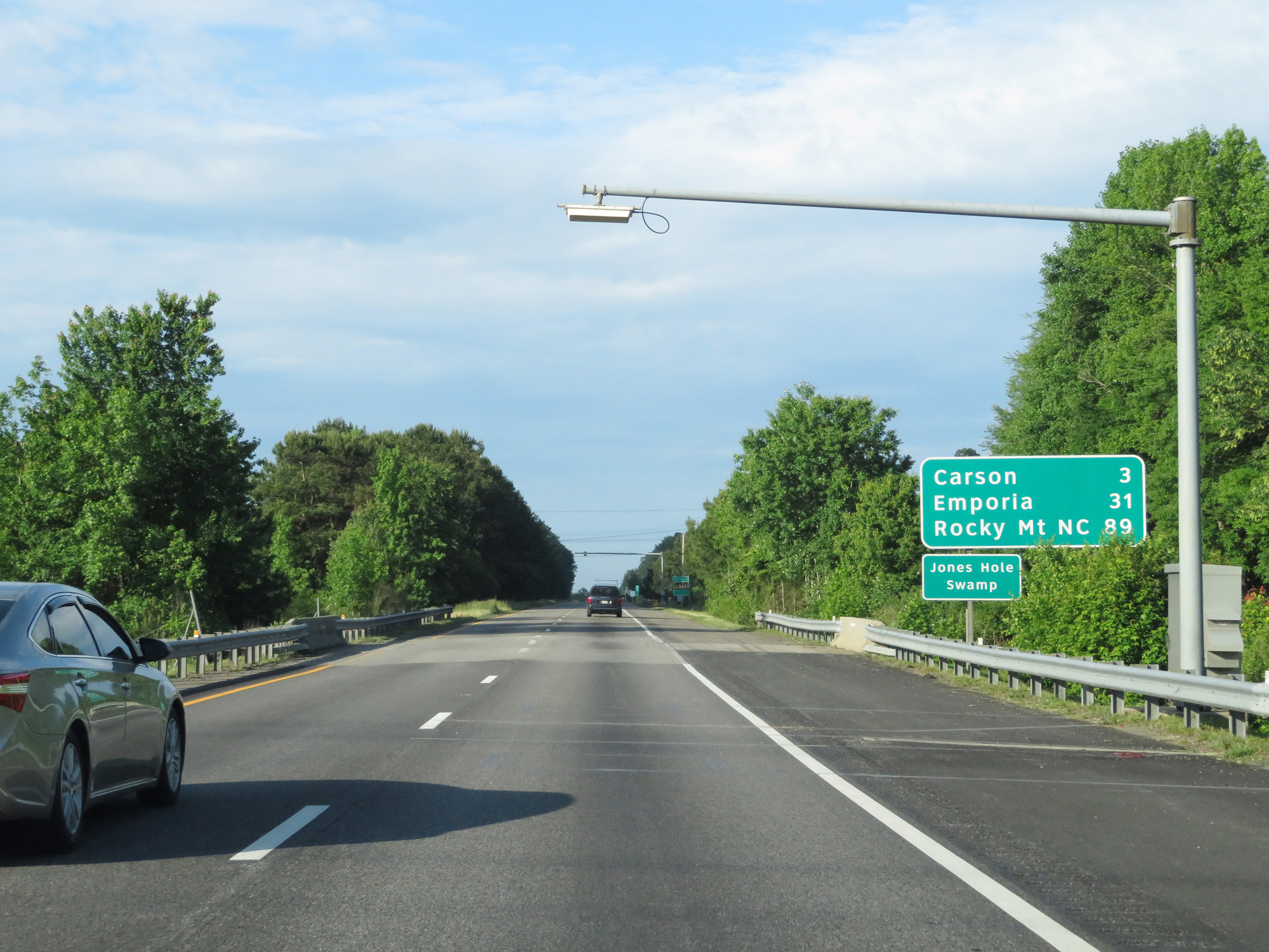 Mileage sign on Interstate 95 South. It's 3 miles to Carson, 31 miles to Emporia, and 89 miles to Rocky Mount. (Photo taken 5/20/17). |