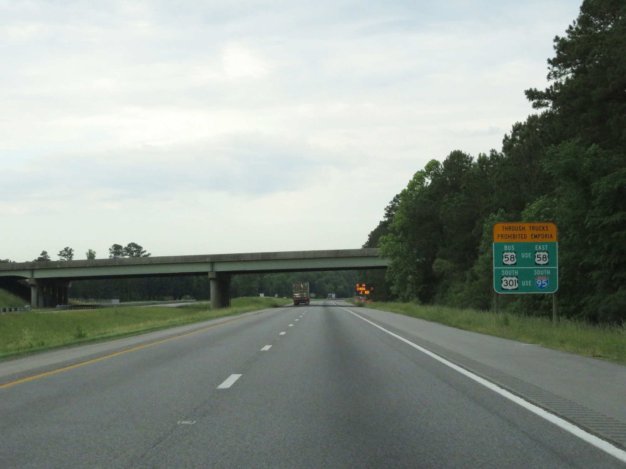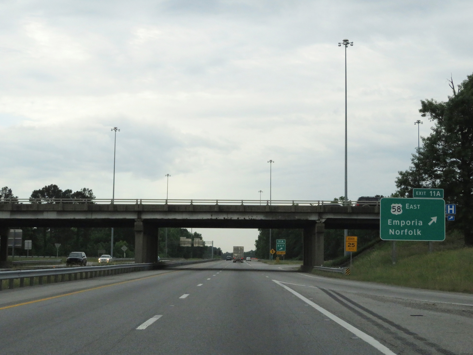Interstate 95 South at Exit 11A: US 58 East - Emporia / Norfolk (Photo taken 5/20/17). |