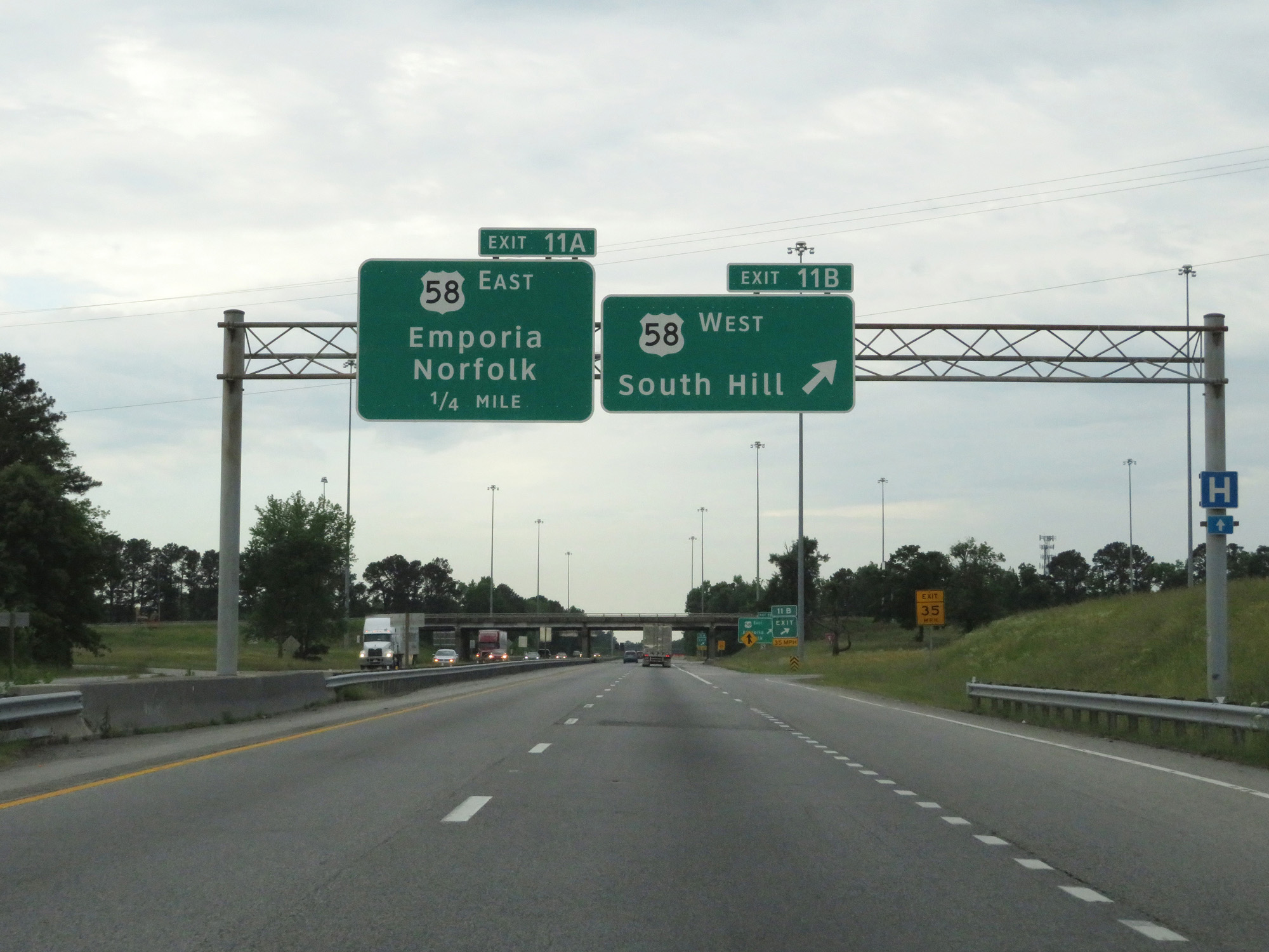 Interstate 95 South at Exit 11B: US 58 West - South Hill (Photo taken 5/20/17). |