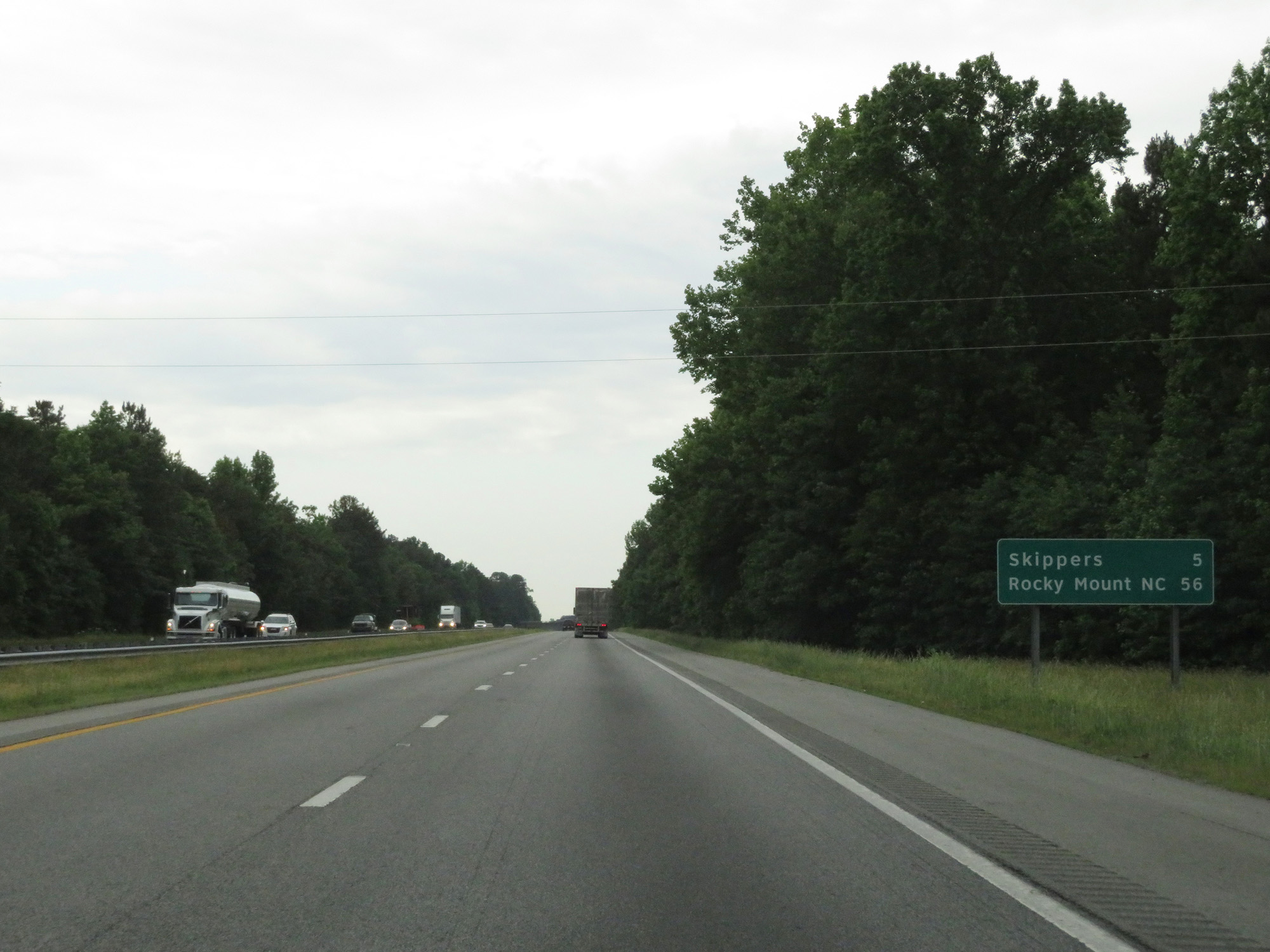 Mileage sign on Interstate 95 South. It's 5 miles to Skippers and 56 miles to Rocky Mount. (Photo taken 5/20/17). |