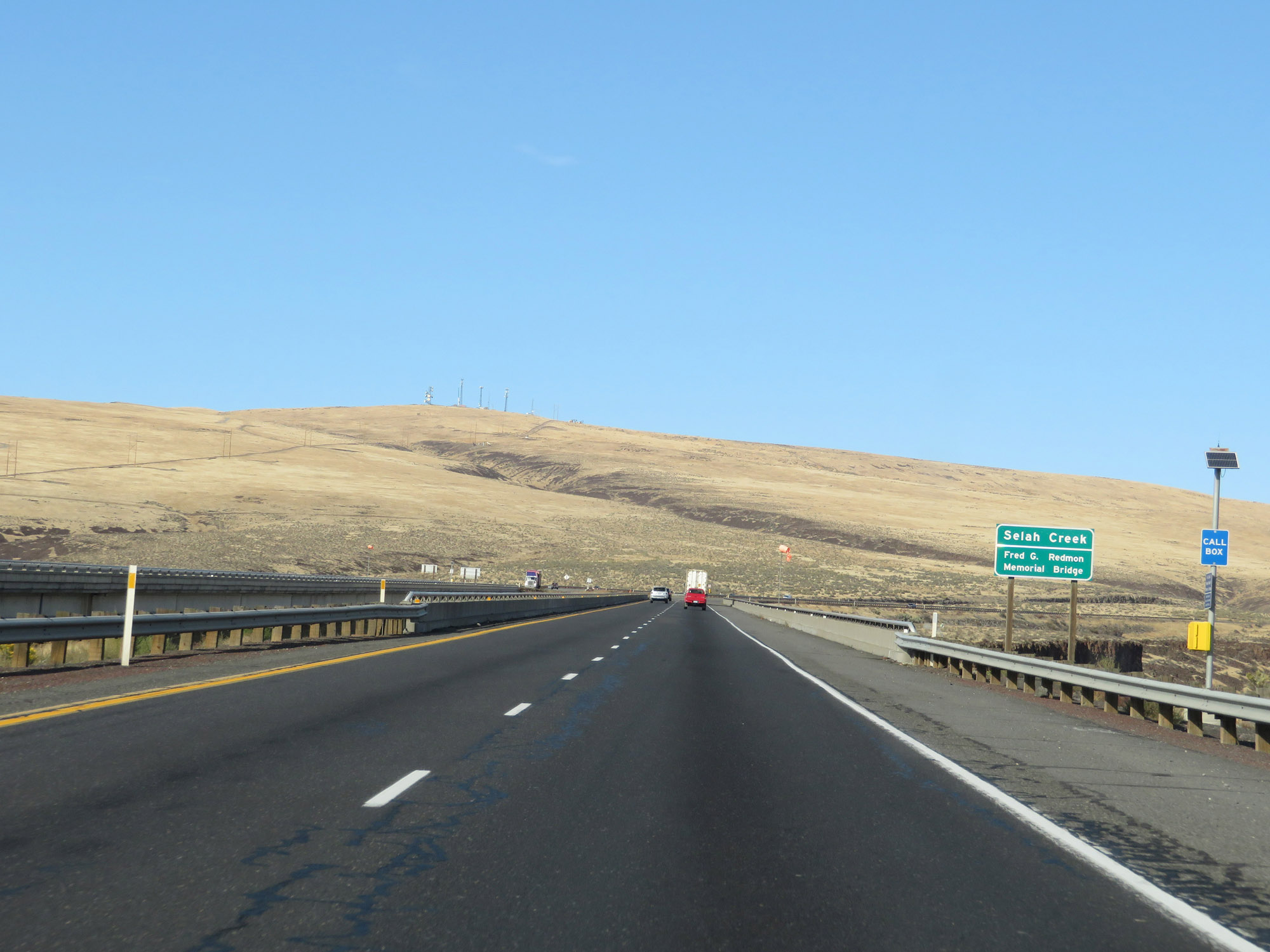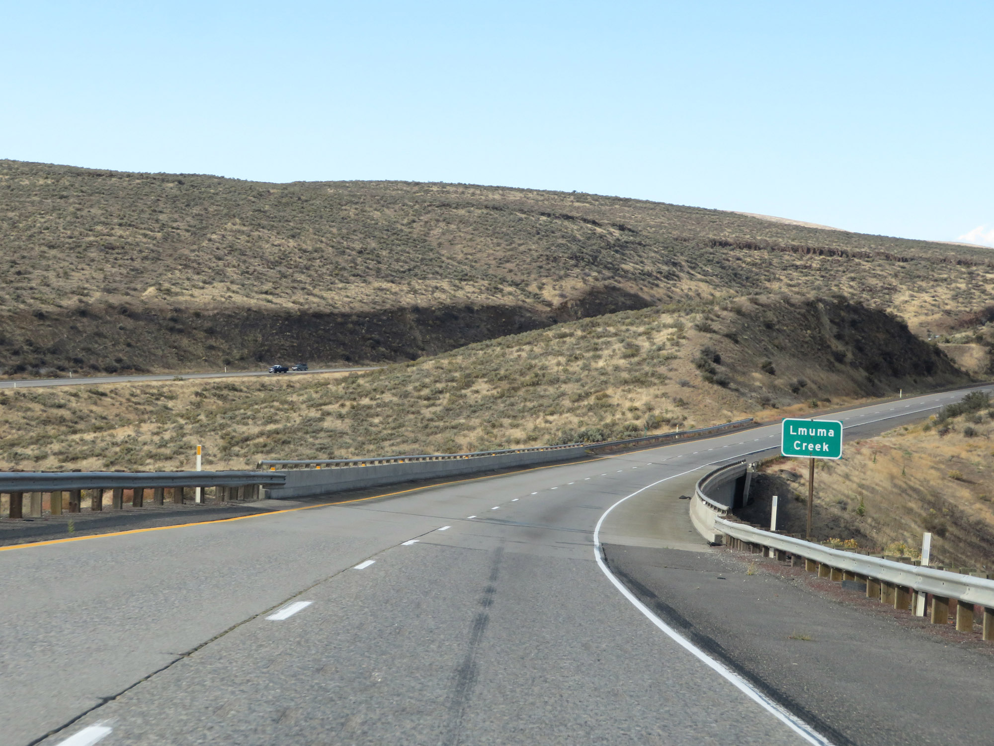 At the bottom of North Umtanum Ridge, Interstate 82 West crosses Lmuma Creek. That's two mountain passes down, one to go. (Photo taken 9/26/19). |