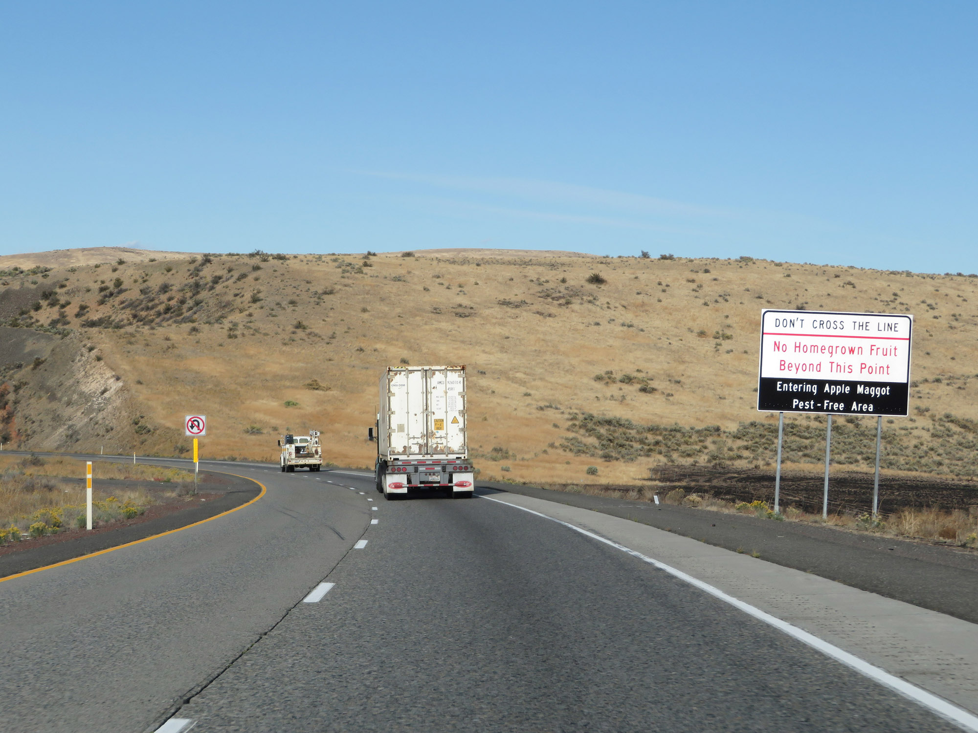 This sign warns that homegrown fruit is prohibited beyond this point, due to Interstate 82 West entering an apple maggot pest-free area. (Photo taken 9/26/19). |