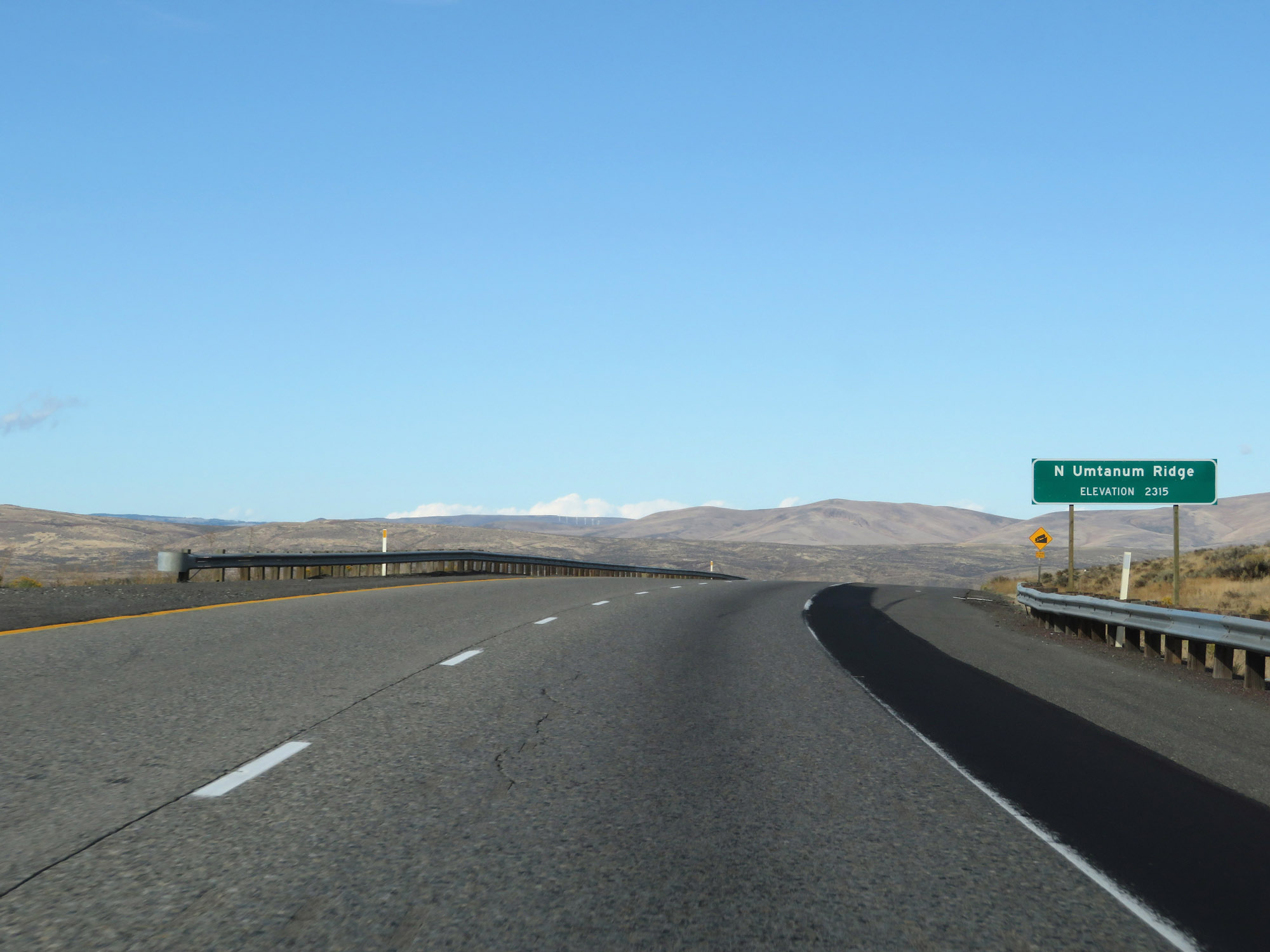 Interstate 82 West at the summit of South Umtanum Ridge, which is at an elevation of 2,265 feet. (Photo taken 9/26/19). |