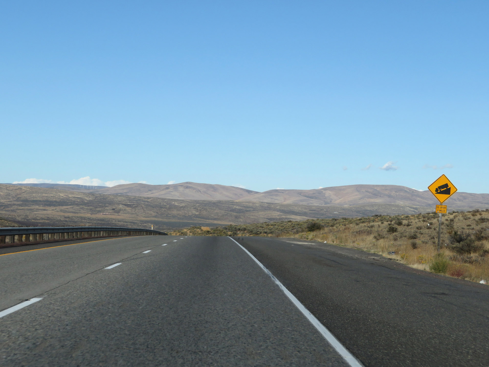 Interstate 82 West promptly begins its descent down North Umtanum Ridge. The downgrade is 5% steepness and will last for the next 2 miles. (Photo taken 9/26/19). |