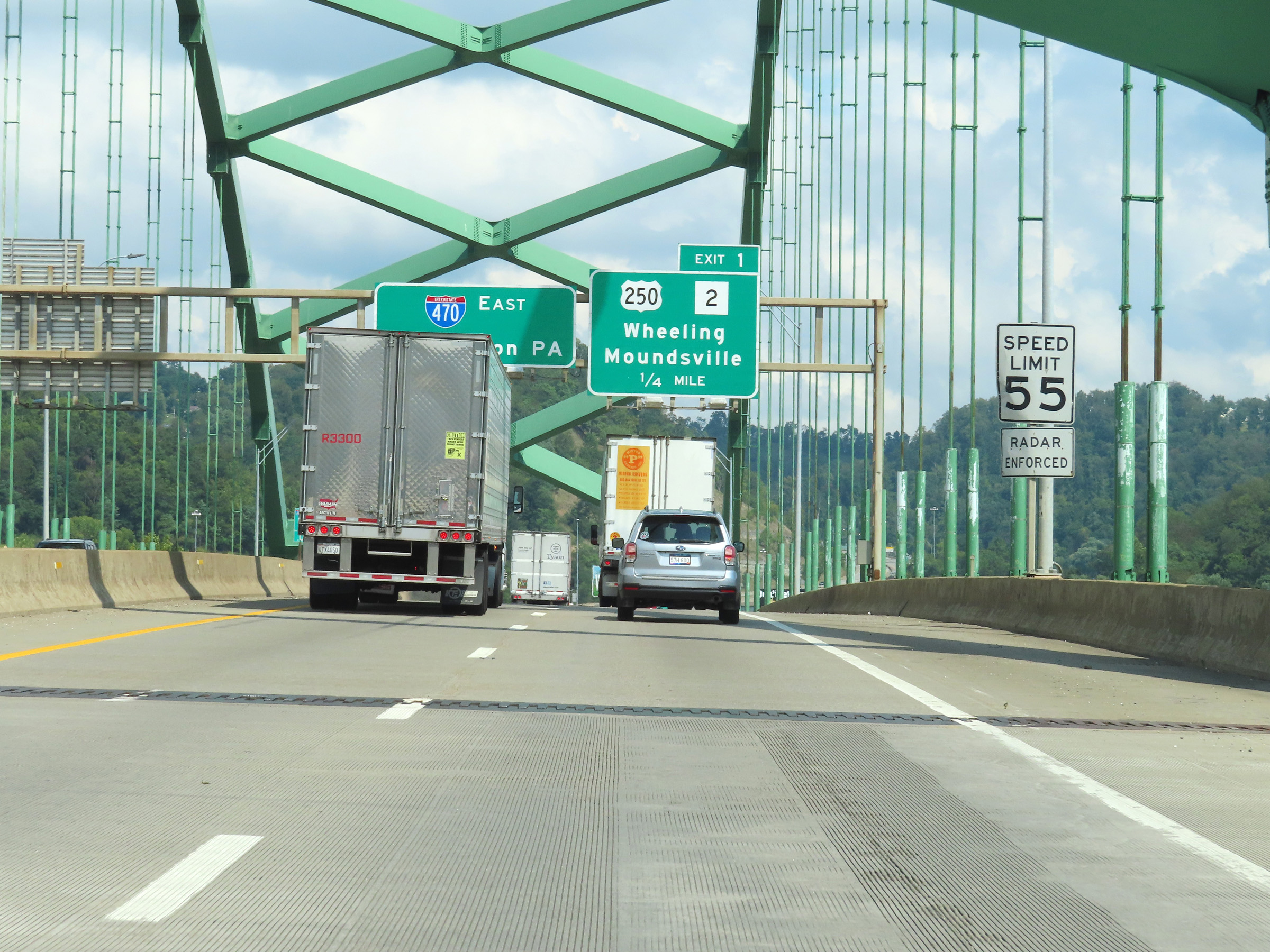 The speed limit on Interstate 470 East in West Virginia starts out at 55 mph as it crosses the Ohio River on the Vietnam Veterans Memorial Bridge. (Photo taken 8/21/22). |