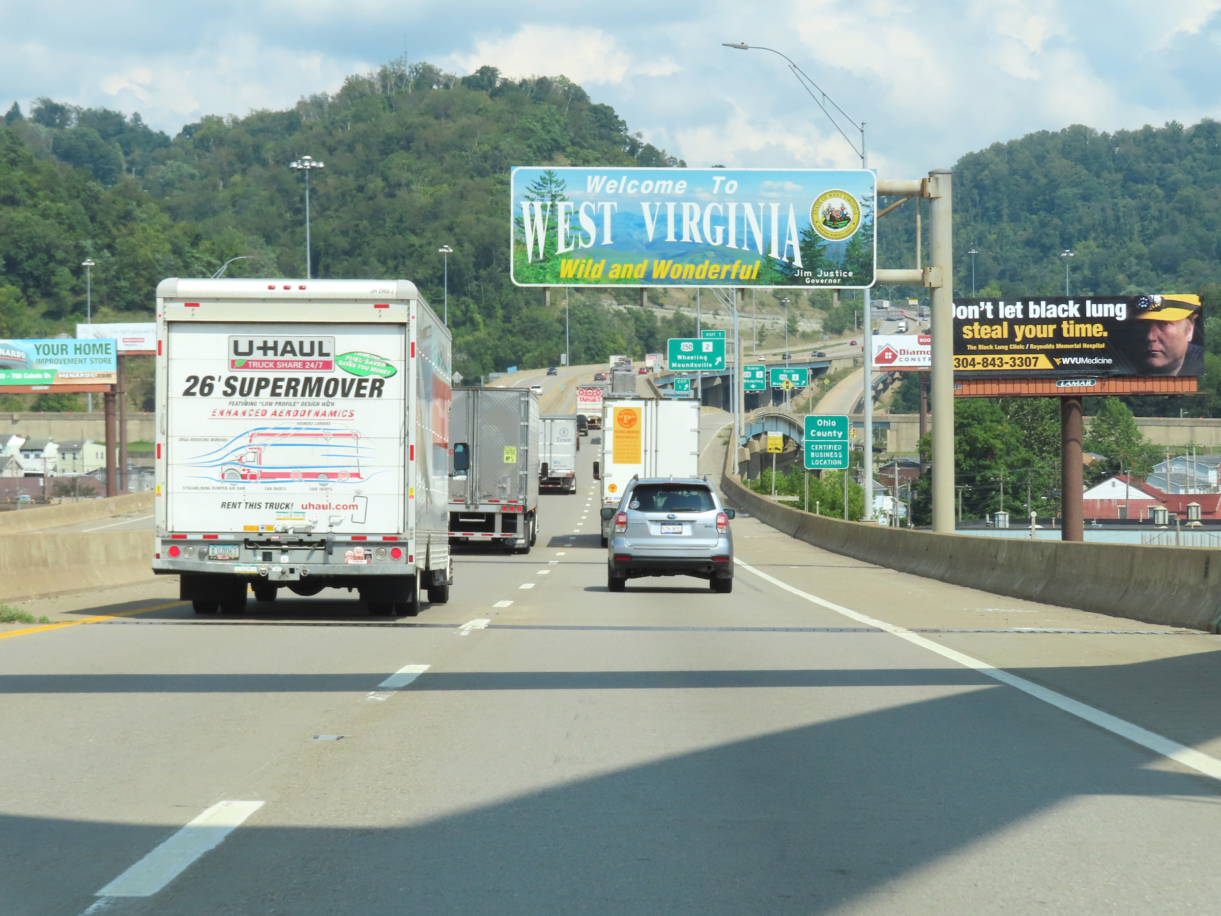 Overhead West Virginia welcome sign on Interstate 470 East. I-470 in West Virginia is entirely located in Ohio County. (Photo taken 8/21/22). |