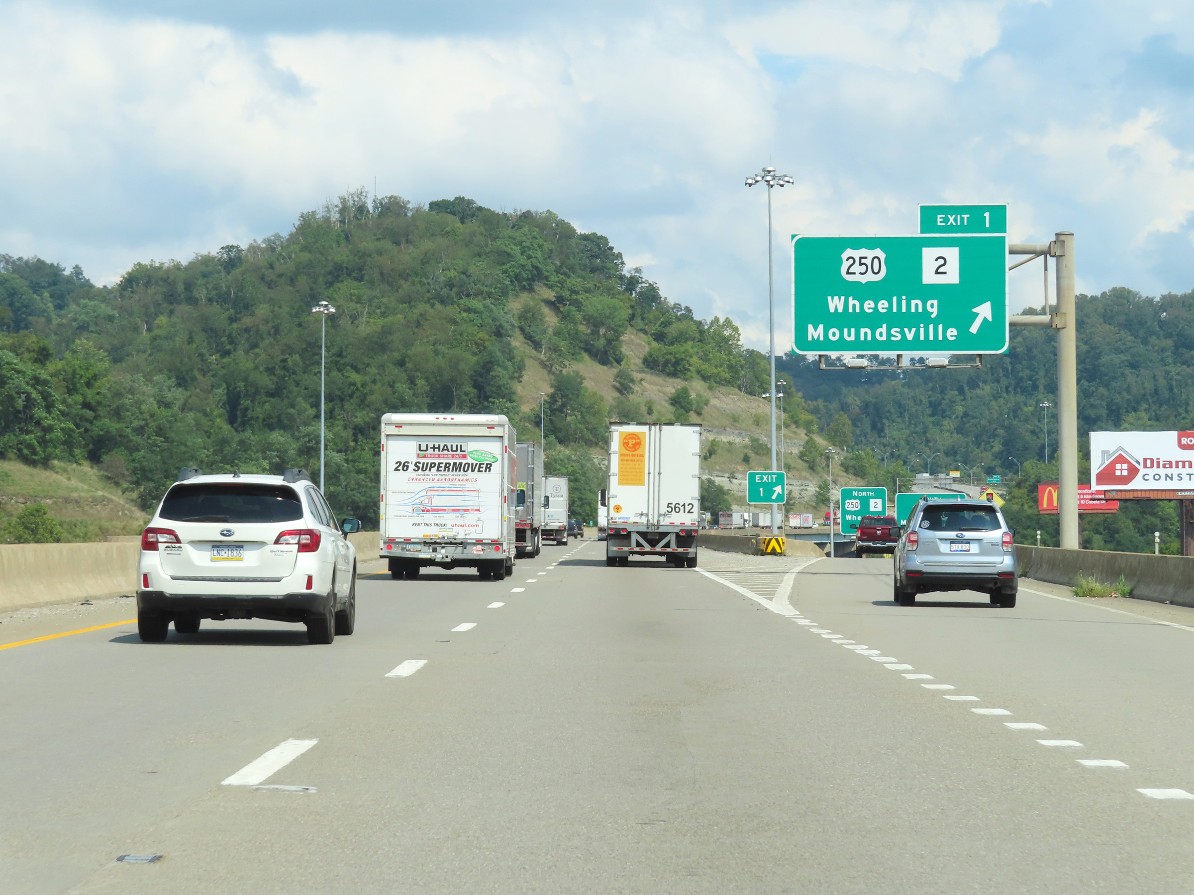 Interstate 470 East at Exit 1: US 250 / WV 2 - Wheeling / Moundsville (Photo taken 8/21/22). |