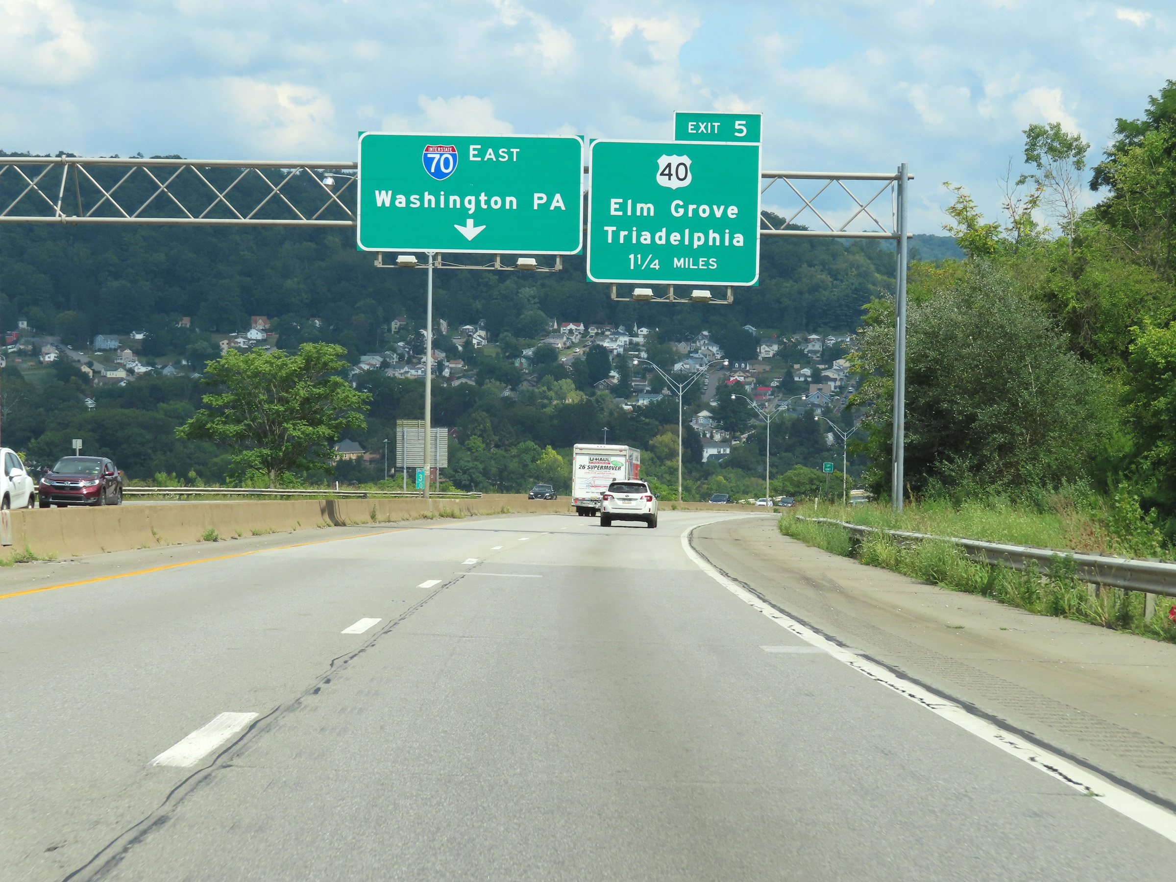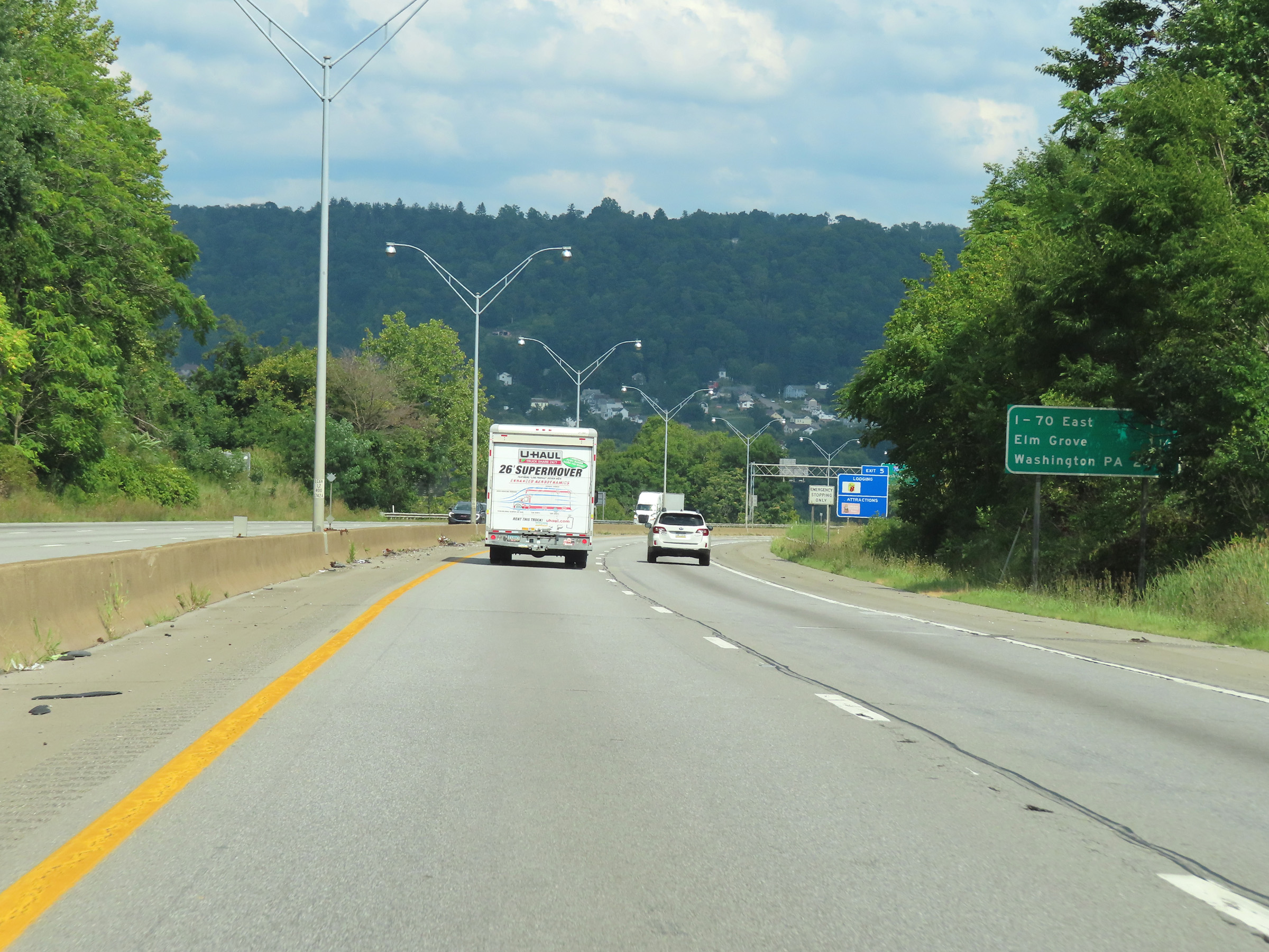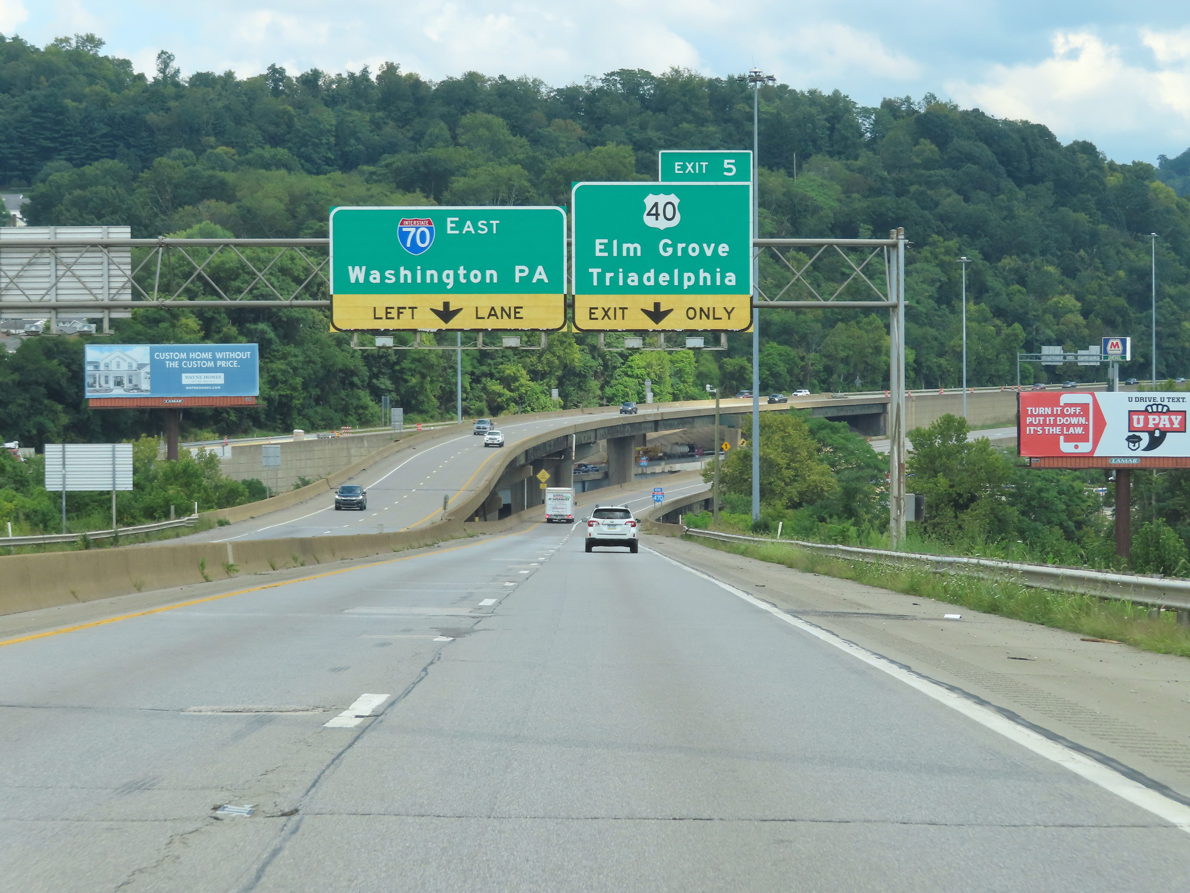 Mileage sign on Interstate 470 East, listing the distances to the junction of Interstate 70 East, Elm Grove, and Washington, PA. (Photo taken 8/21/22). |