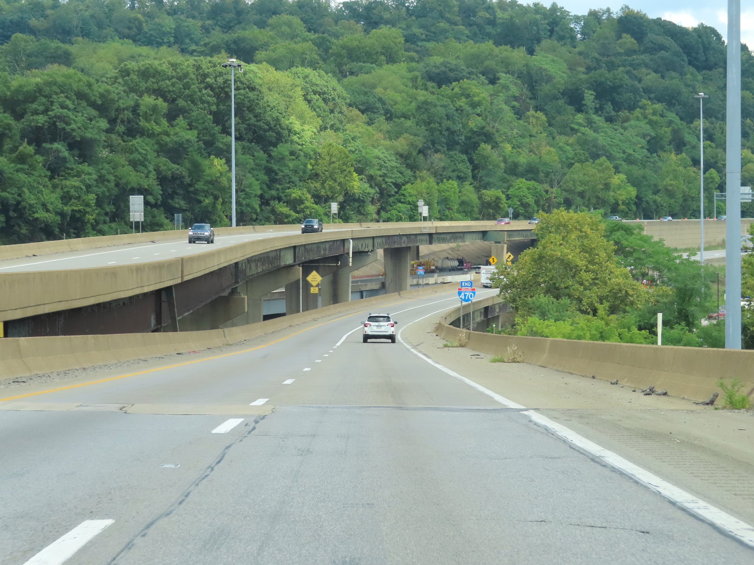 View on Interstate 470 East as it reaches the bottom of the grade and its eastern terminus at the junction of Interstate 70 East. (Photo taken 8/21/22). |