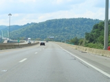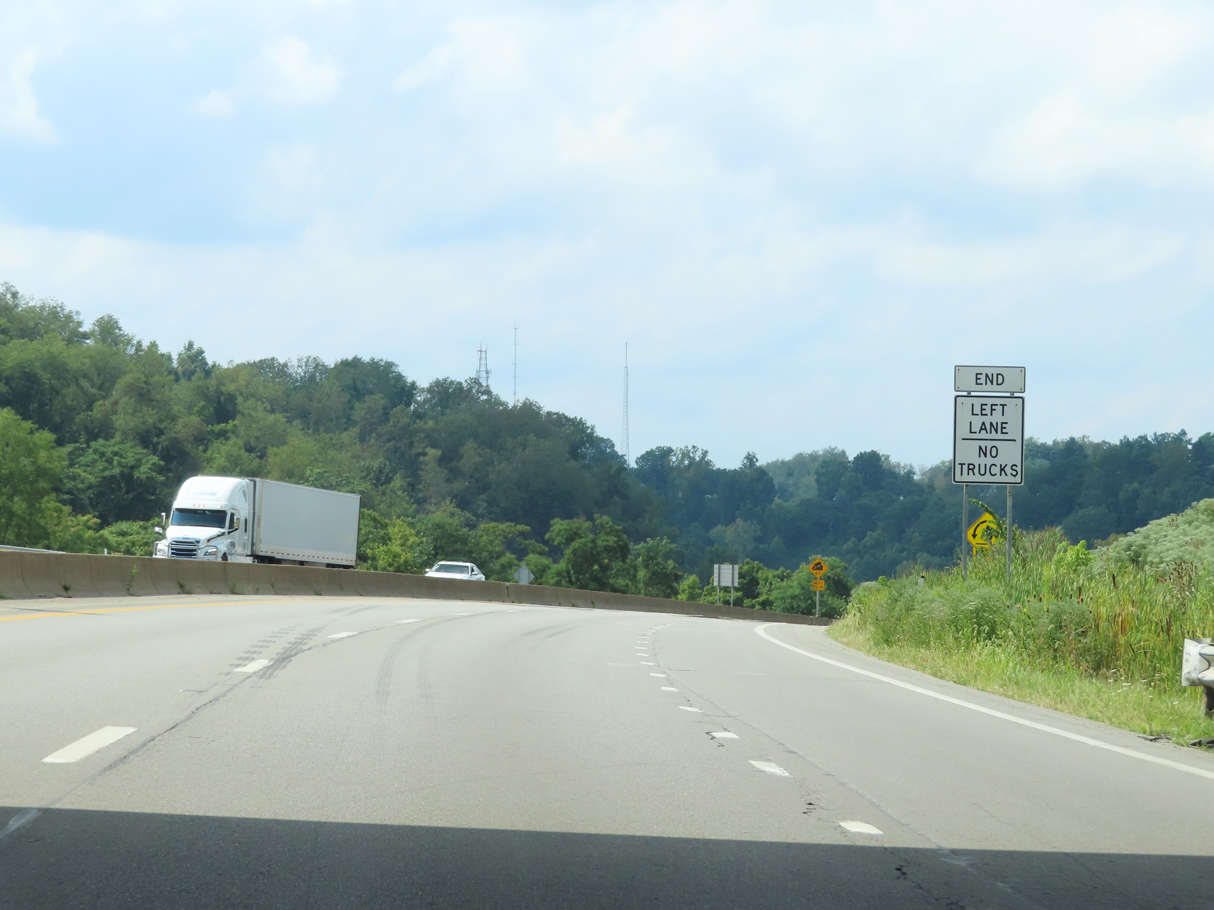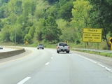 About 1/2 mile after it begins, Interstate 470 West starts to climb the grade seen here. A truck climbing lane begins, and as these signs read, trucks are prohibited in the left lane while climbing the hill. (Photo taken 8/21/22). |