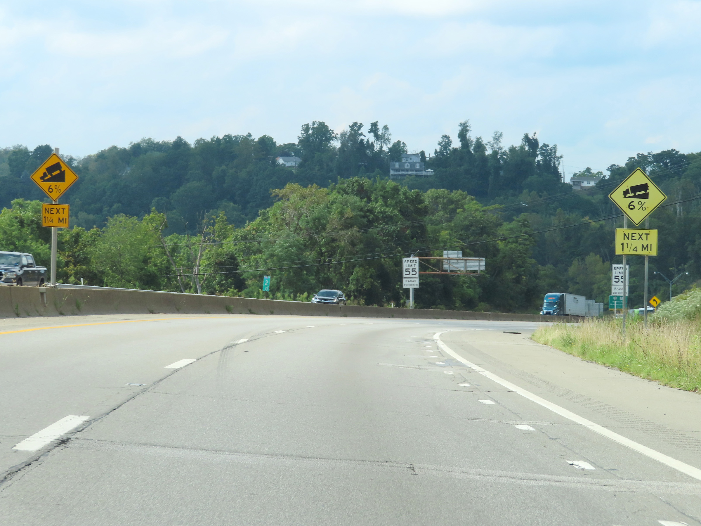These warning signs at mile marker 2 show that Interstate 470 West will traverse a 6% downgrade which lasts for the next 1 1/4 miles as it descends down toward the Ohio River. (Photo taken 8/21/22). |