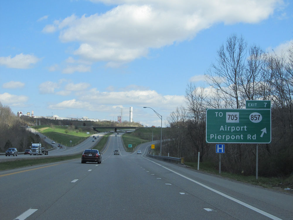 Interstate 68 East at Exit 7: CR 857 / To WV 705 - Airport / Pierpont Rd (Photo taken 4/11/15).