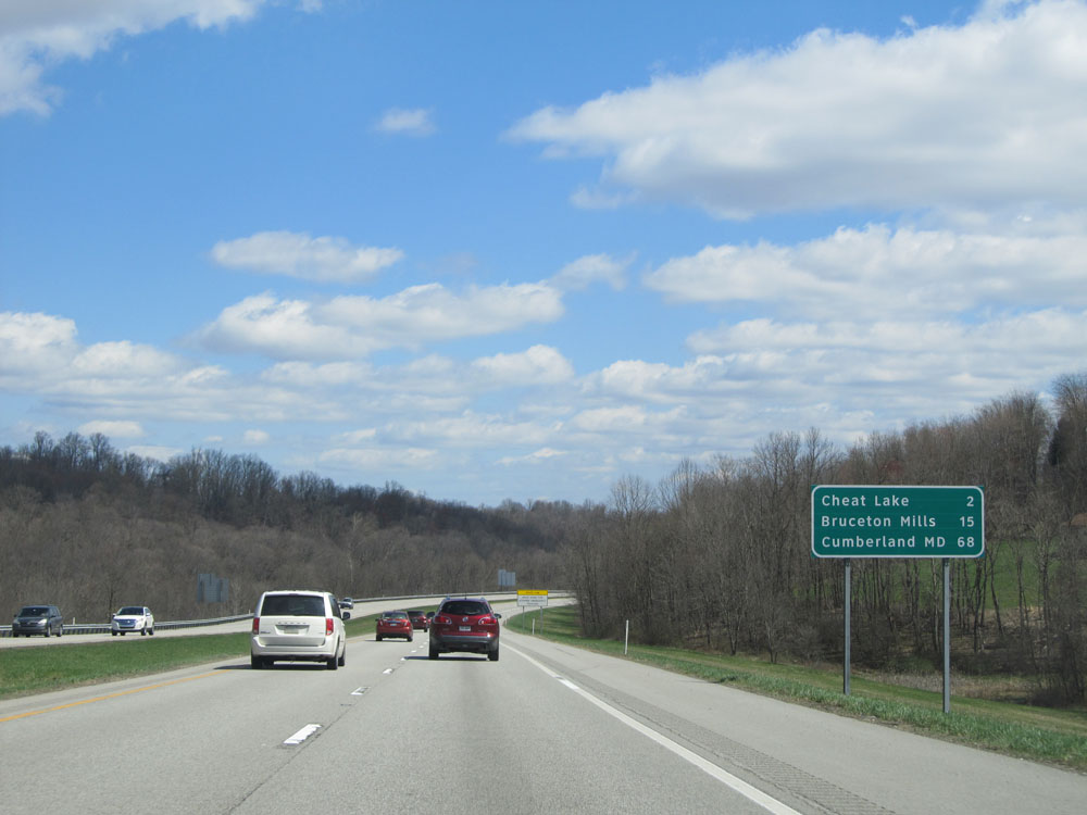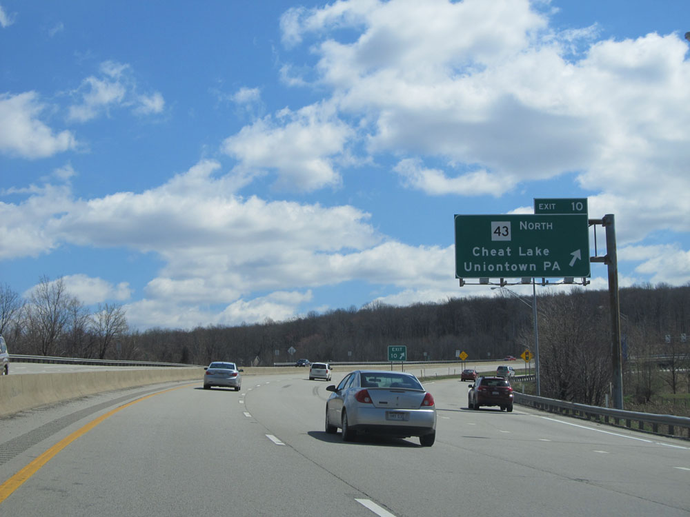 Interstate 68 East at Exit 10: WV 43 North - Cheat Lake / Uniontown, PA (Photo taken 4/11/15).