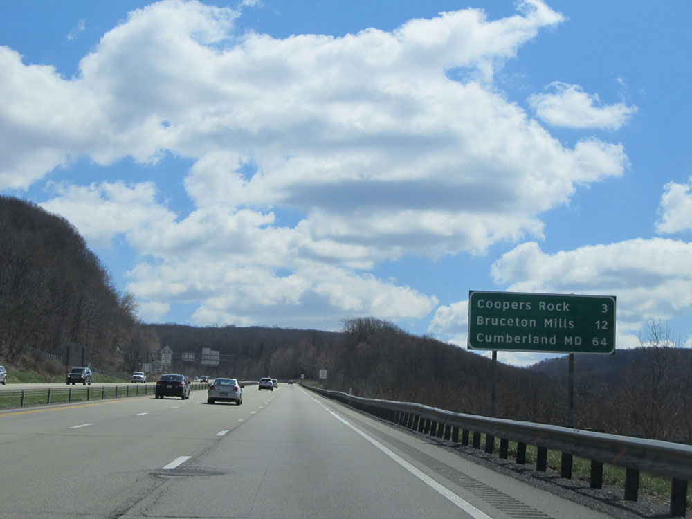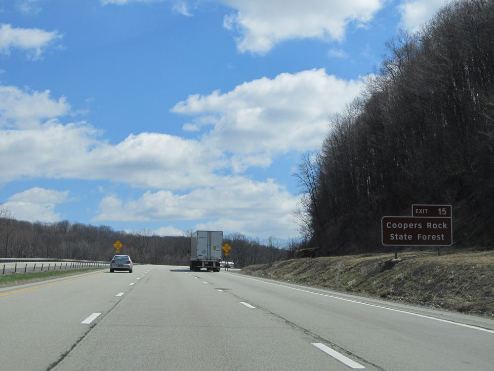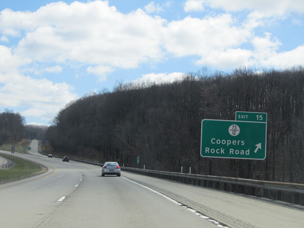 Interstate 68 East at Exit 15: CR 73/12 - Coopers Rock Road (Photo taken 4/11/15).