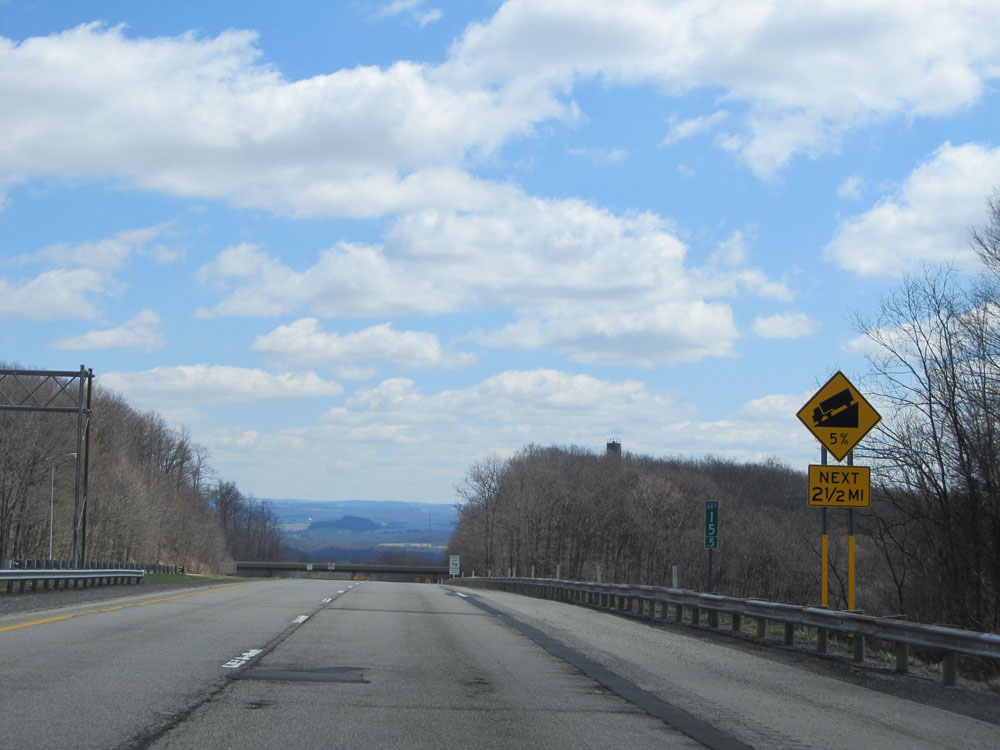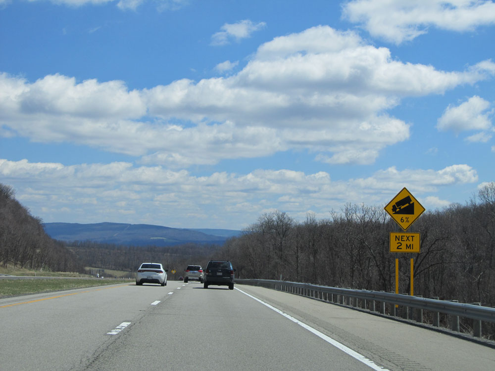 Warning sign located near mile marker 31, once again alerting truck drivers of a steep downgrade ahead. This one is a 6% grade which lasts for the next 2 miles, into Maryland. (Photo taken 4/11/15).