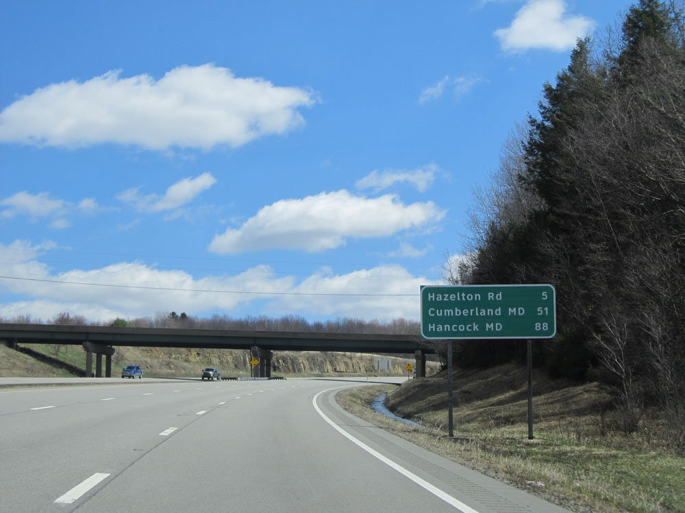 Mileage sign located near mile marker 24. It's 5 miles to the next exit, which is Hazelton Rd. Meanwhile, it's 51 miles to Cumberland, MD and 88 miles to Hancock, MD. (Photo taken 4/11/15).