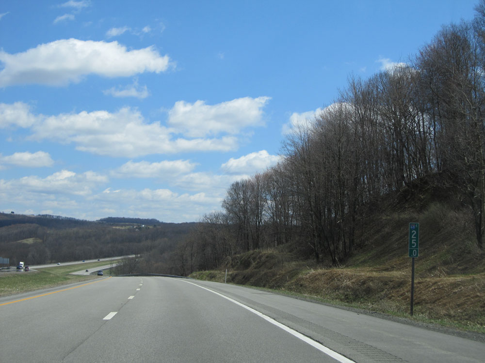 Interstate 68 East: Road view from mile marker 25. (Photo taken 4/11/15).