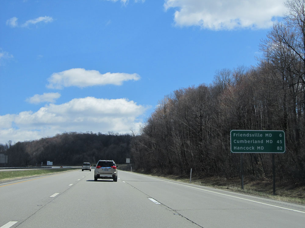 Mileage sign located near mile marker 29. It's 6 miles to Friendsville, MD, 45 miles to Cumberland, MD, and 82 miles to Hancock, MD. (Photo taken 4/11/15).