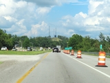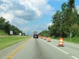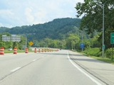 Interstate 70 East will once again be briefly reduced to a single lane ahead, as its right lane becomes and Exit Only lane for Exit 4. I-70 East thru traffic should move to the left lane at this point. (Photo taken 8/21/22). |