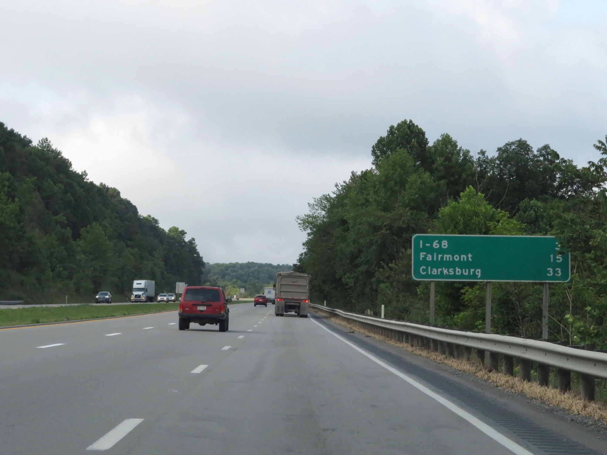 Mileage sign on Interstate 79 South. It's 3 miles to the junction of Interstate 68, 15 miles to Fairmont, and 33 miles to Clarksburg. (Photo taken 8/9/19). |