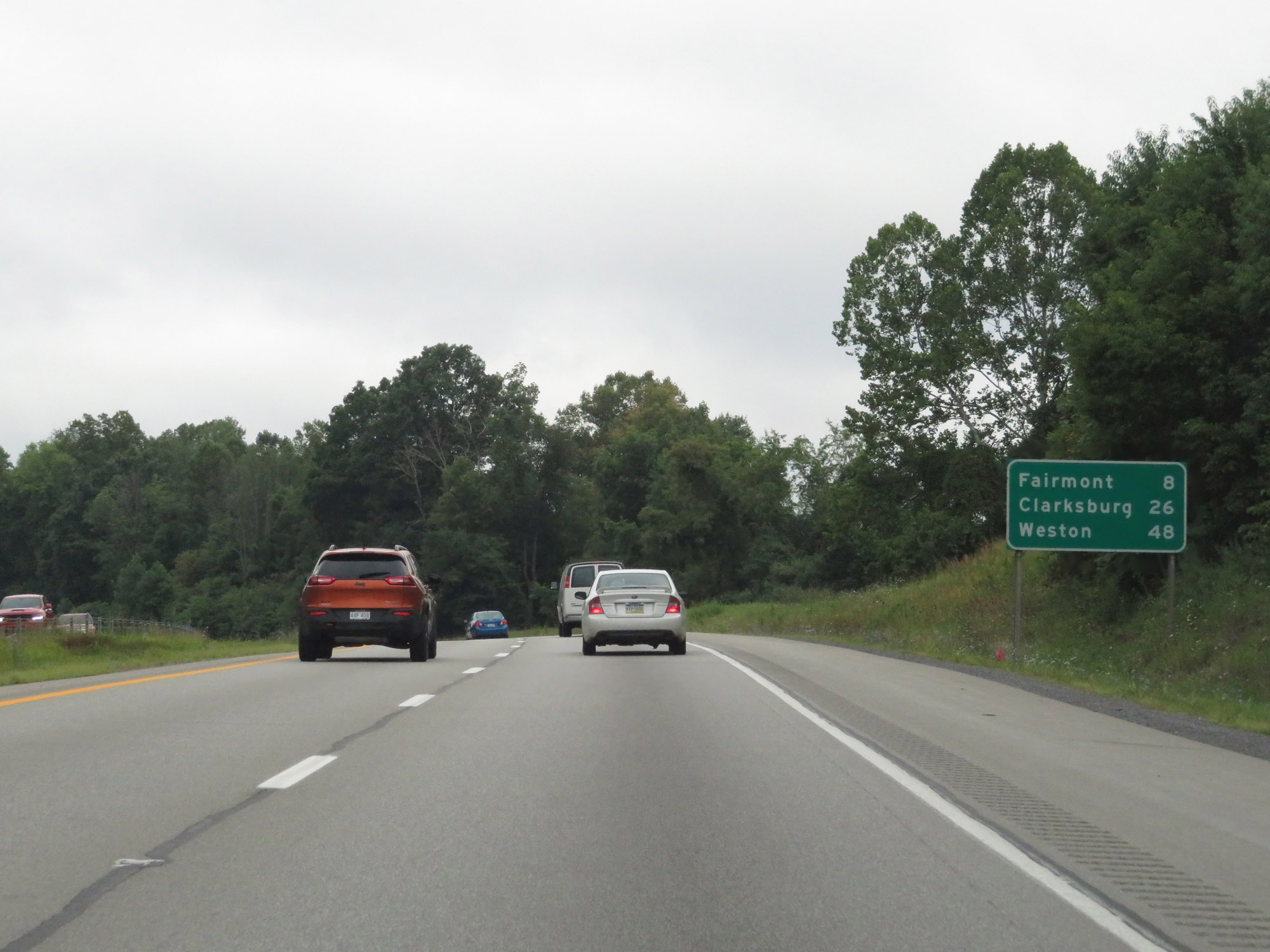 Mileage sign on Interstate 79 South. It's 8 miles to Fairmont, 26 miles to Clarksburg, and 48 miles to Weston. (Photo taken 8/9/19). |