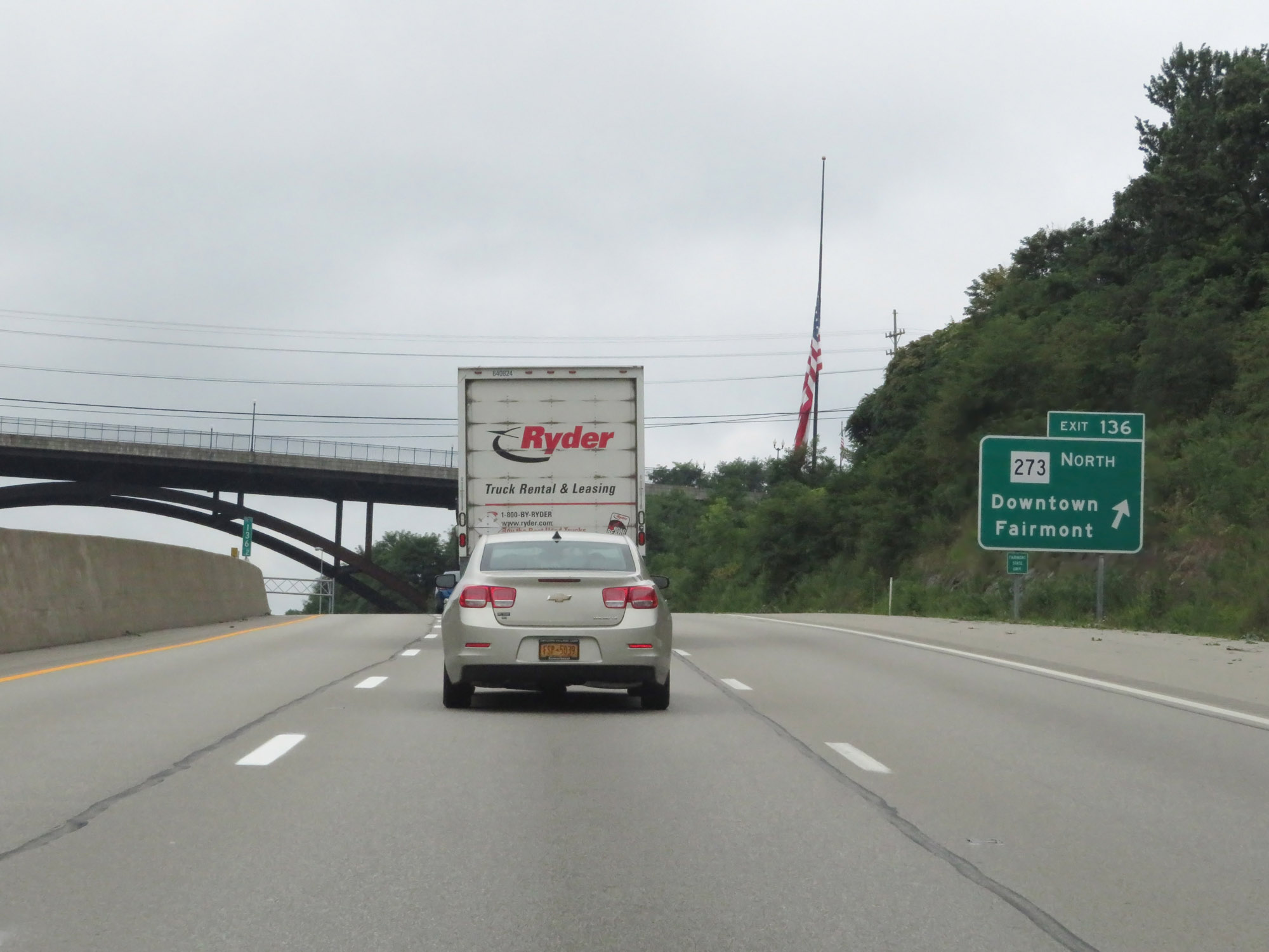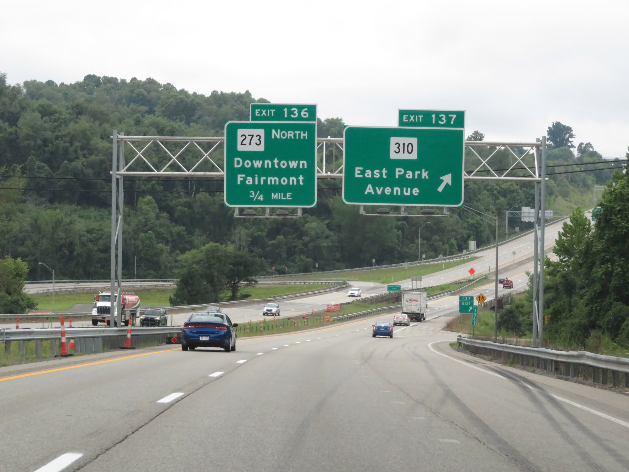 Interstate 79 South at Exit 136: WV 273 North - Downtown Fairmont (Photo taken 8/9/19). |