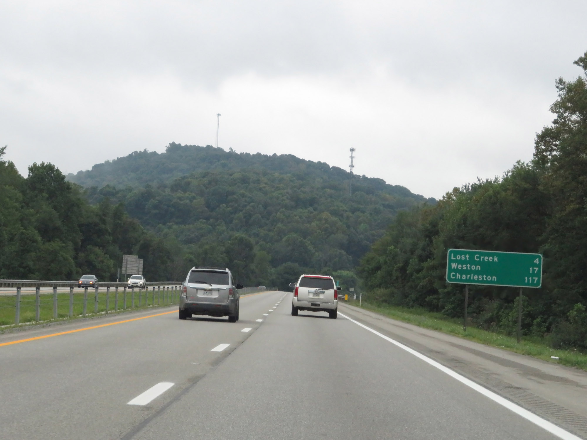 Mileage sign on Interstate 79 South. It's 4 miles to Lost Creek, 17 miles to Weston, and 117 miles to Charleston. (Photo taken 8/9/19). |