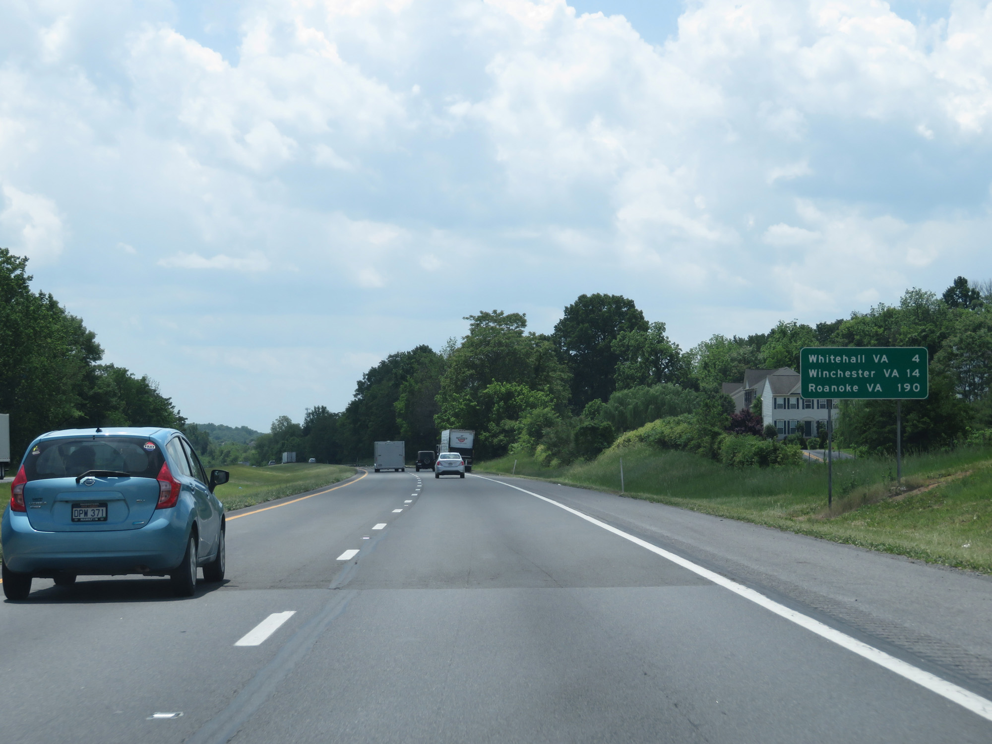 Mileage sign on Interstate 81 South. It's 4 miles to Whitehall, 14 miles to Winchester, and 190 miles to Roanoke. (Photo taken 5/19/17). |