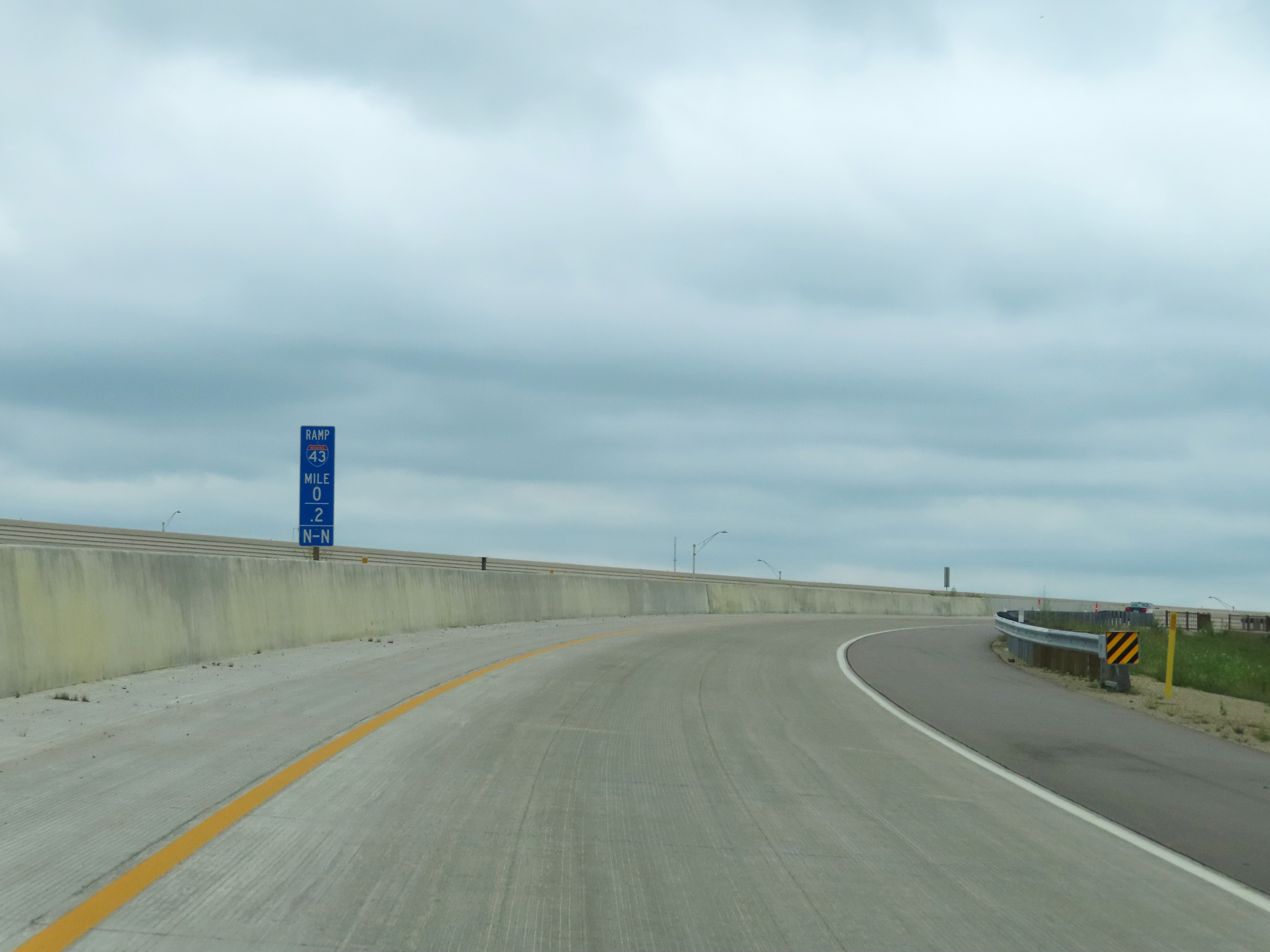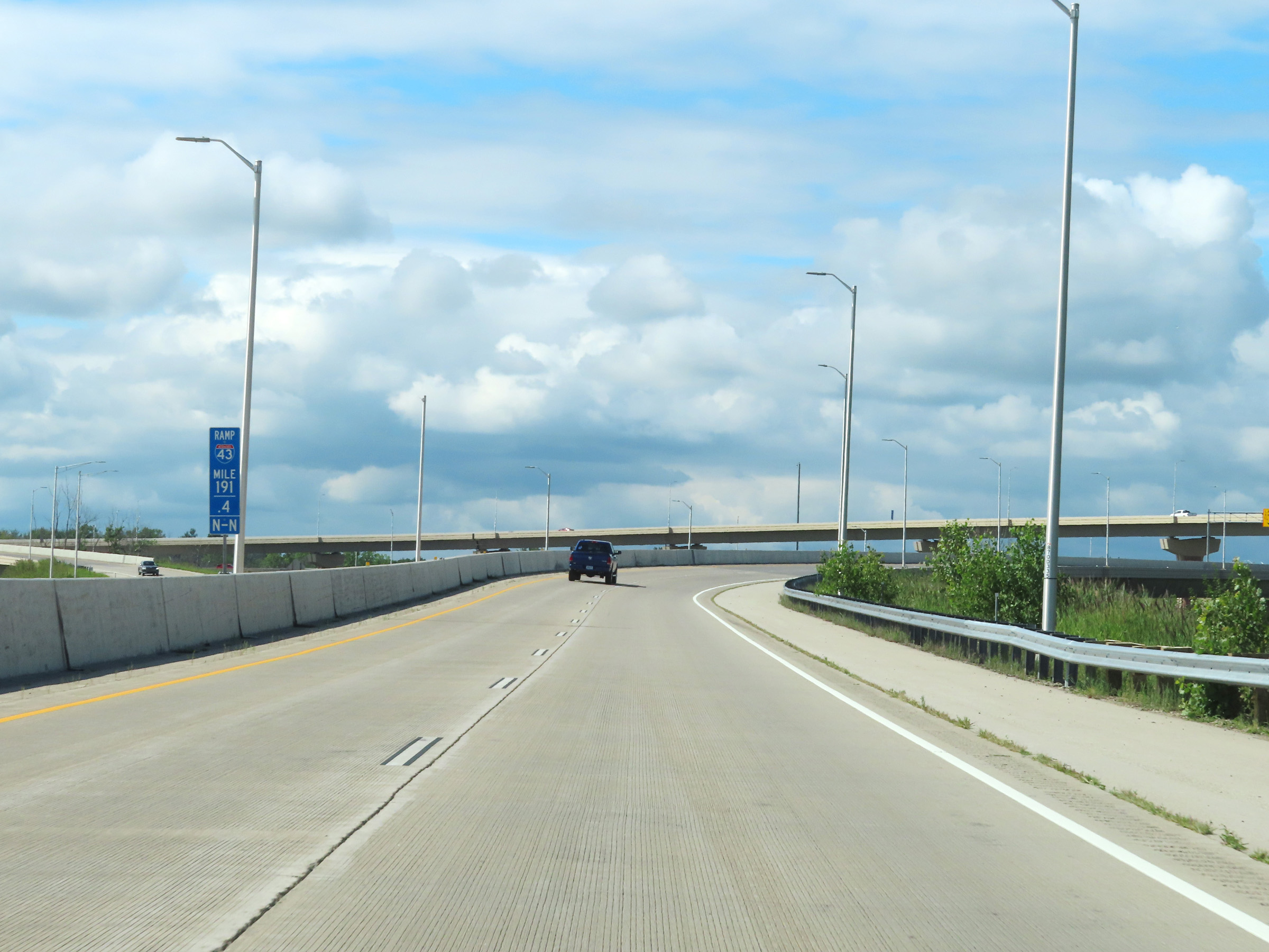 Interstate 43 North / Interstate 94 West as I-94 West departs to the right. It will fly over I-43 North ahead as it curves to the west. (Photo taken 8/14/22). |