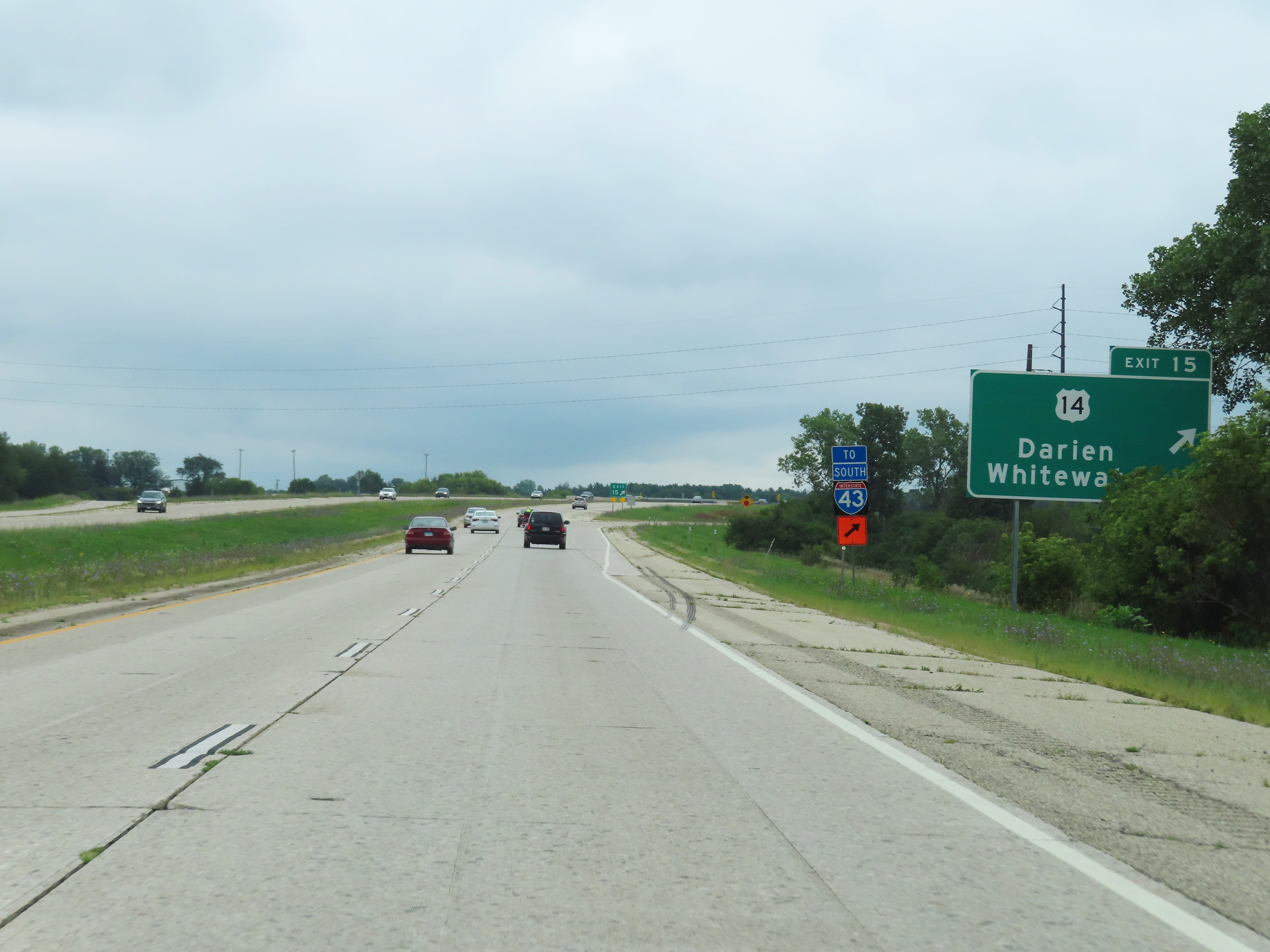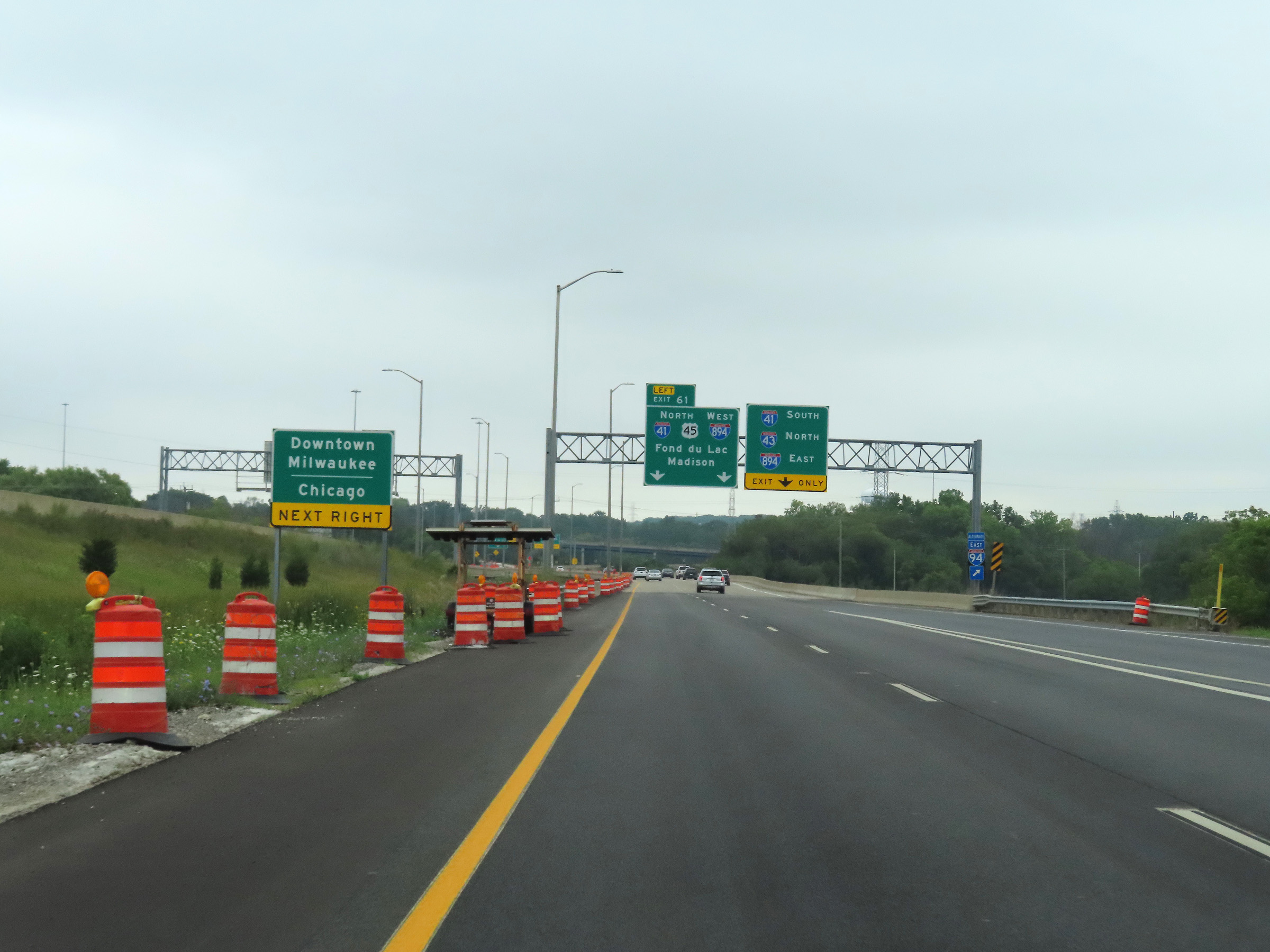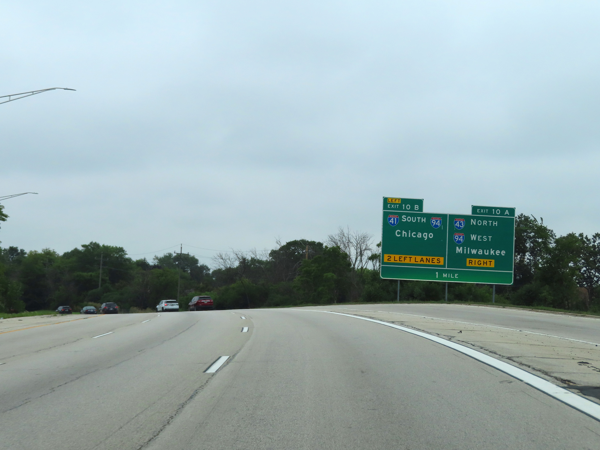Interstate 43 North / Interstate 41 South / Interstate 894 East at Exit 10A: Interstate 43 North / Interstate 94 West - Milwaukee; Exit 10B: Interstate 41 South / Interstate 94 East - Chicago (Photo taken 8/14/22). |