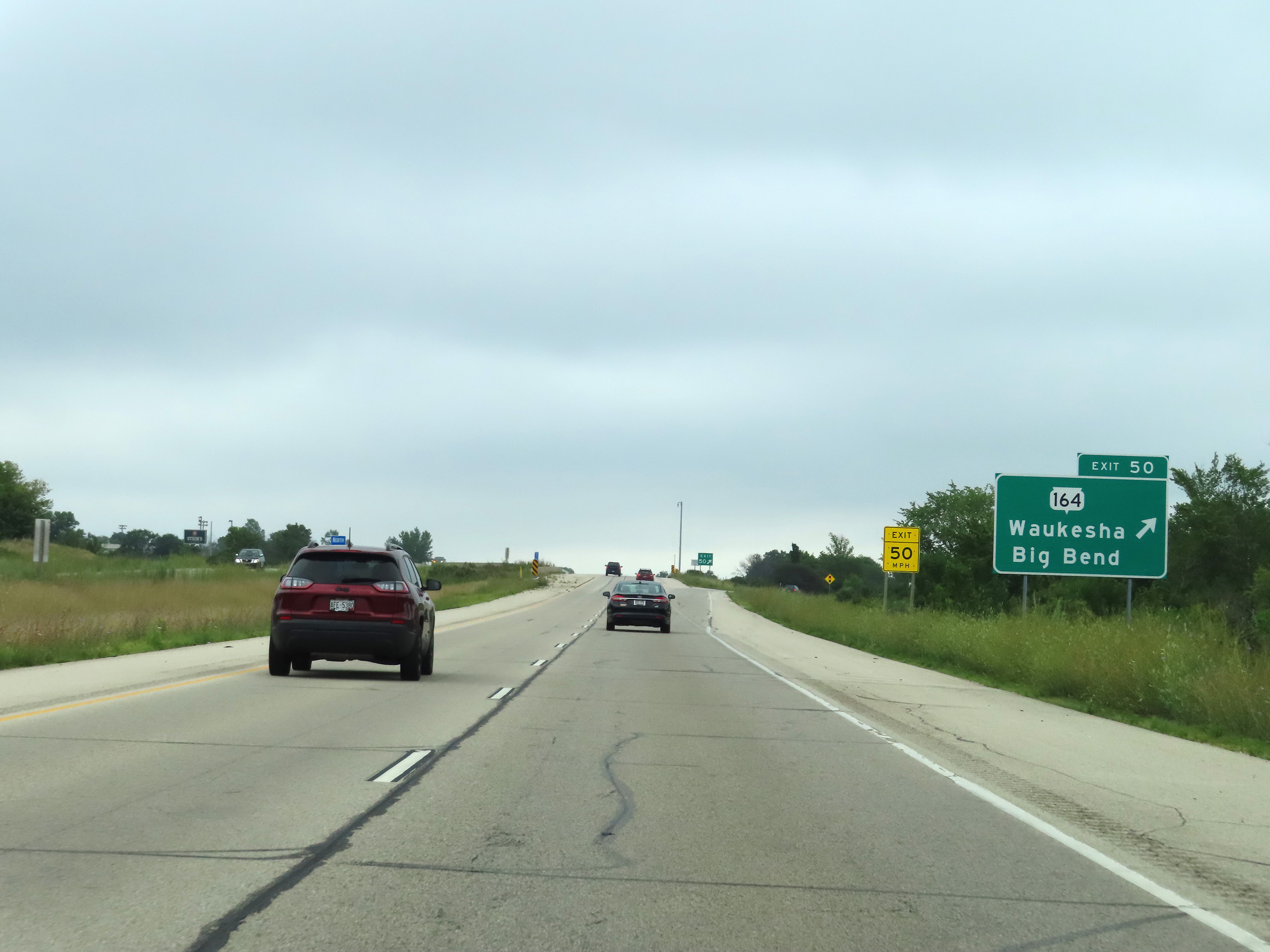 After the speed limit had increased to 55 mph once again for a time after the Interstate 43 North / Interstate 94 West concurrency began, it will once again decrease to 50 mph ahead. (Photo taken 8/14/22). |