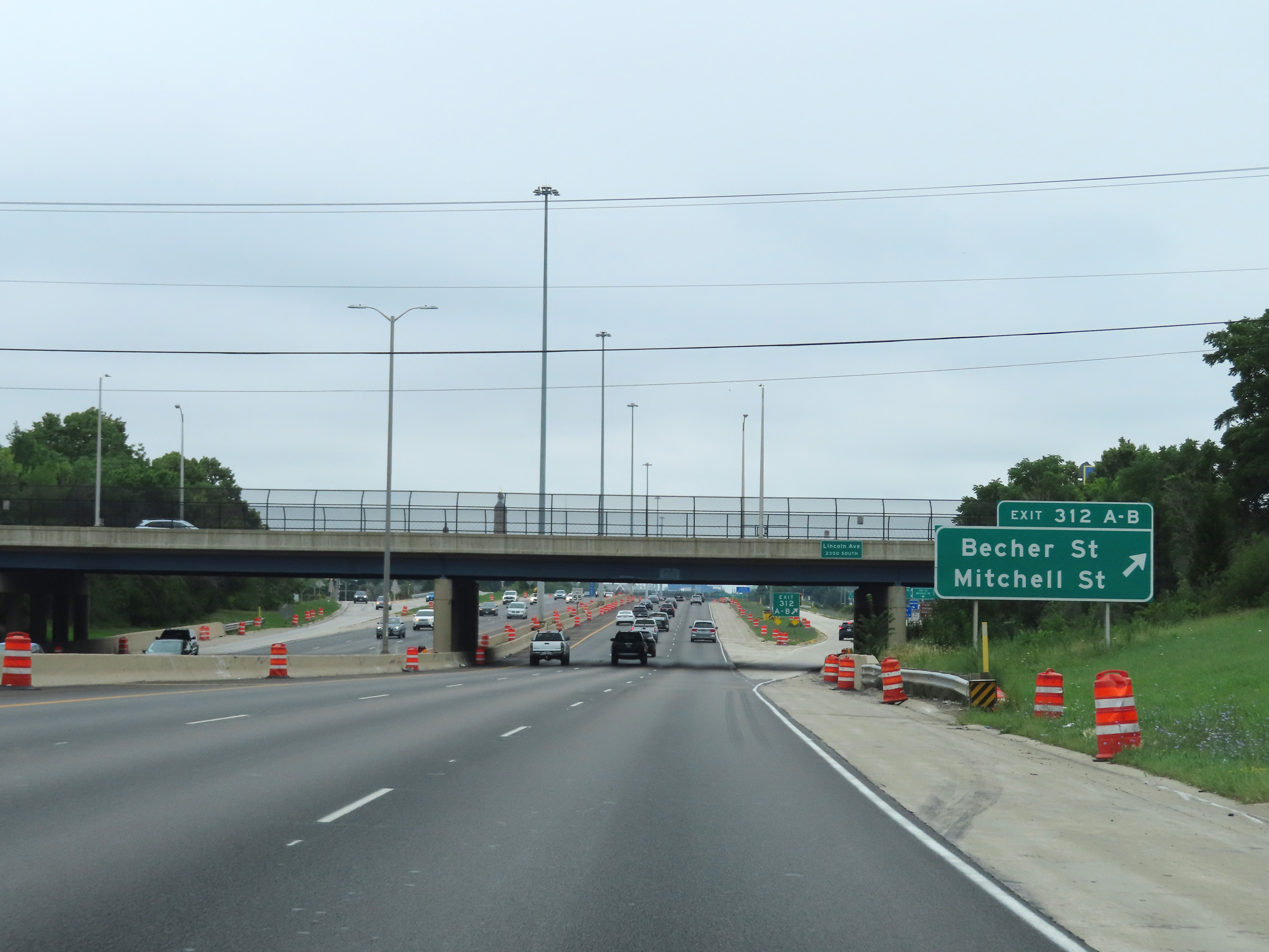 Interstate 43 North / Interstate 94 West at Exits 312A-B: Becher St / Mitchell St (Photo taken 8/14/22). |