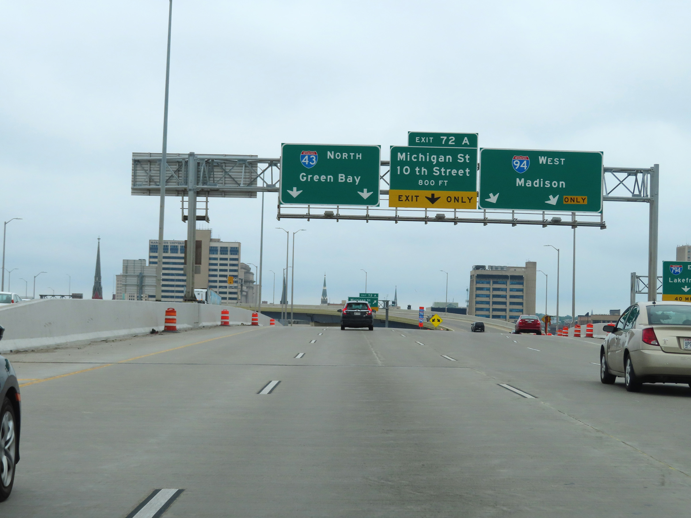 Interstate 43 North at Exit 72A: Michigan St / 10th Street (Photo taken 8/14/22). |
