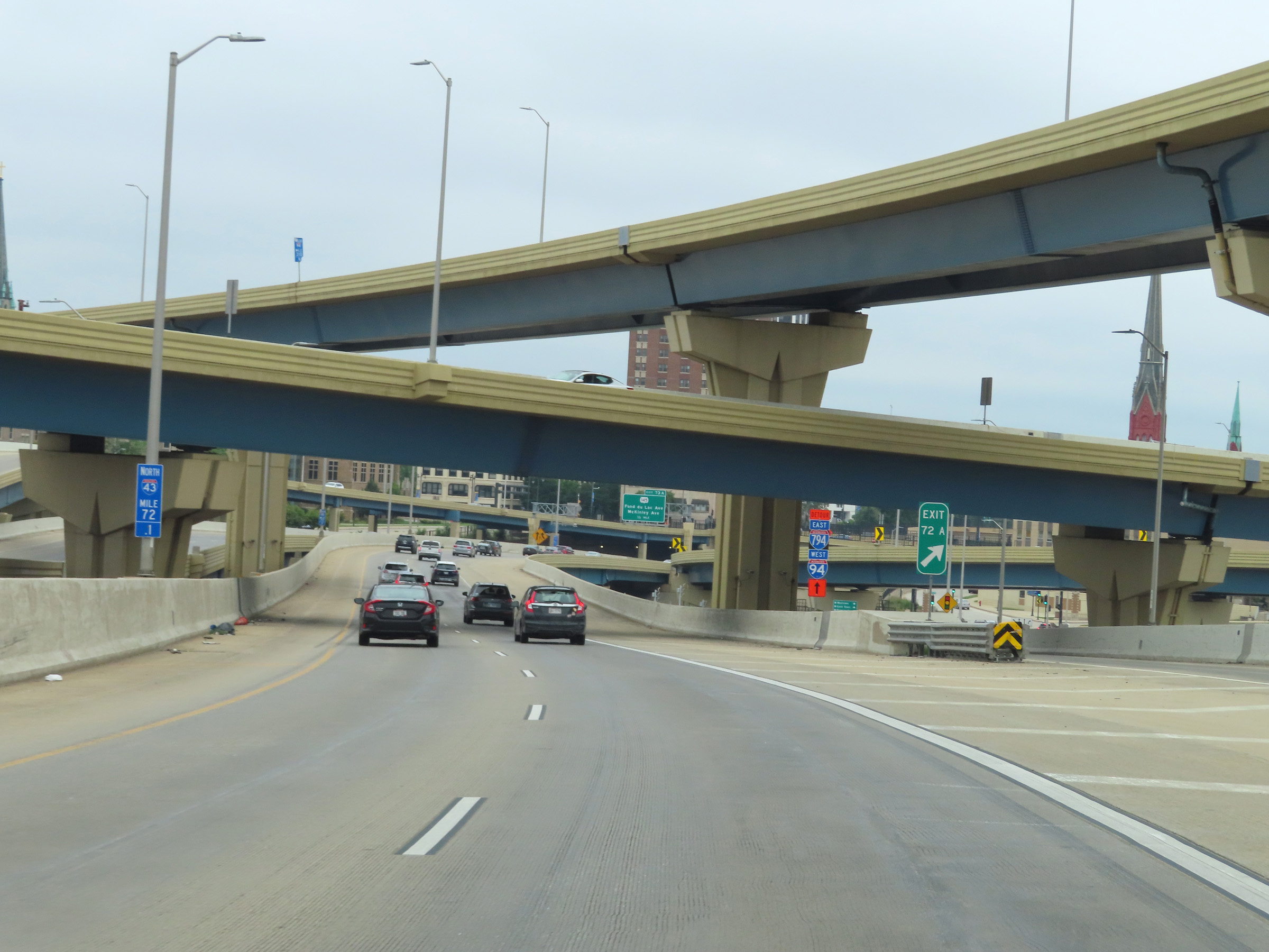 Traffic to Michigan St and 10th Street should keep left and follow Interstate 43 North to Exit 72A. (Photo taken 8/14/22). |